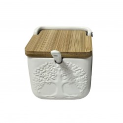 AZUCARERO CUADRADO BLANCO ARBOL Referencia: 22110126 Medidas: 8.3x8.3x8.3 cm. Material: Bambú Dolomita Packaging: CAJA MARRÓN Info: 0.152778 kg. VERSA BACKSTAMP BROWN BOX BARCODE LABEL WHITE COLOR