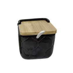 AZUCARERO CUADRADO NEGRO HOJAS Referencia: 22110134 Medidas: 8.3x8.3x8.3 cm. Material: Bambú Dolomita Packaging: CAJA MARRÓN Info: 0.152778 kg. VERSA BACKSTAMP BROWN BOX BARCODE LABEL BLACK COLOR