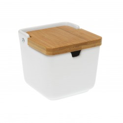 AZUCARERO BLANCO TAPA BAMBÚ Referencia: 18551859 Medidas: 9.5x1x9 cm. Material: Bambú Cerámica Packaging: CAJA BLANCA Info: 0.433333 kg. Tapa de bambú cuchara de acero inoxidable incluida