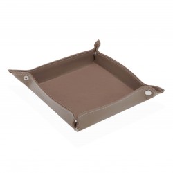VACIABOLSILLOS MARRON 13CM Referencia: 22660026 Medidas: 13x13x3.3 cm. Material: Polipiel Packaging: CAJA MARRÓN VERSA Info: 0.104167 kg. Bandeja con acabado en PU liso, producto sintético