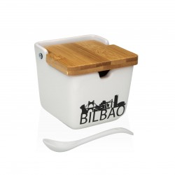 AZUCARERO TAPA BAMBÚ BILBAO Referencia: 21440572 Medidas: 8.8x8.8x8.5 cm. Material: Cerámica Packaging: CAJA LITOGRAFIADA VERSA Info: 0.2708 kg. Cucharilla inlcuida Diseño propio