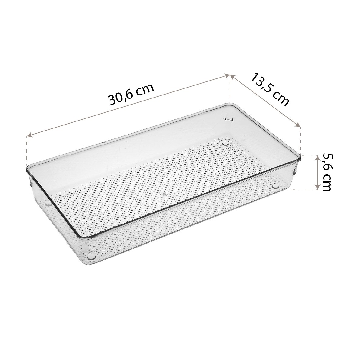 Con unas dimensiones de 5,6 cm de altura, 30,6 cm de ancho y 13,5 cm de largo, es ideal para almacenar frascos, botes y alimentos envasados.