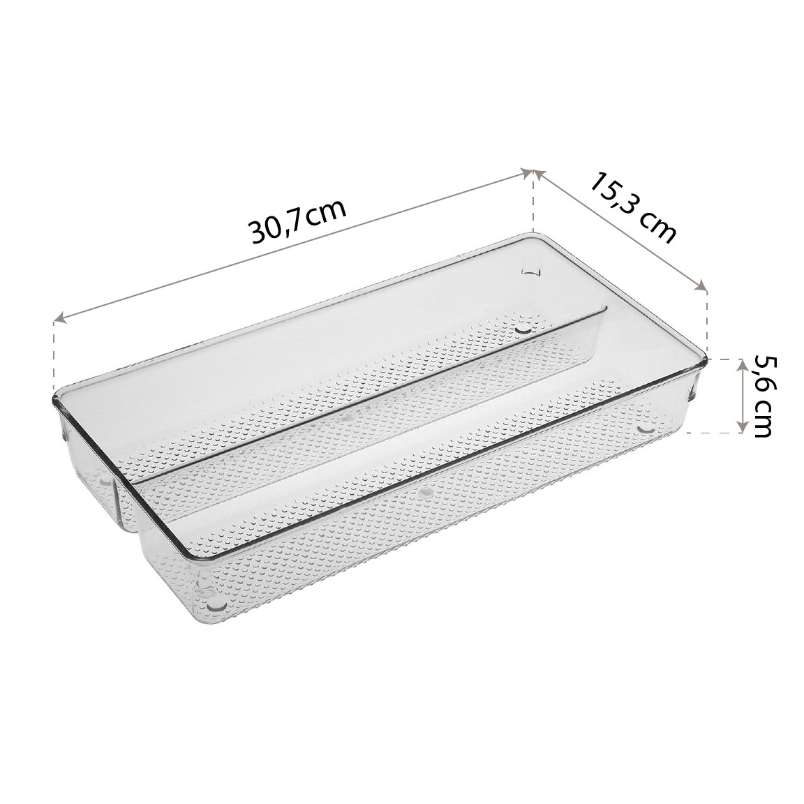 Con unas dimensiones de 5,8 cm de altura, 30,7 cm de ancho y 15,3 cm de largo, se adapta a espacios estrechos en la nevera, despensas o armarios.