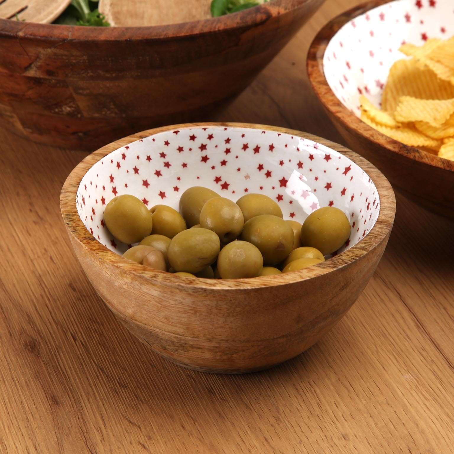El bol esmaltado Stella combina la calidez de la madera de mango con un interior esmaltado decorado con estrellas rojas, creando un atractivo visual que se adapta a diversos estilos decorativos.