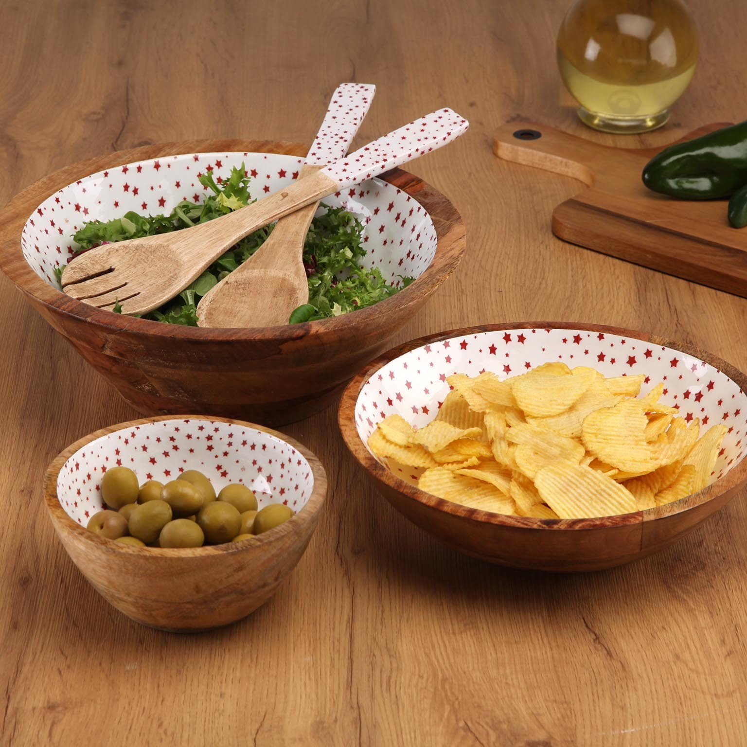 La ensaladera esmaltada Stella combina la calidez de la madera de mango con un interior esmaltado en blanco, adornado con estrellas rojas.