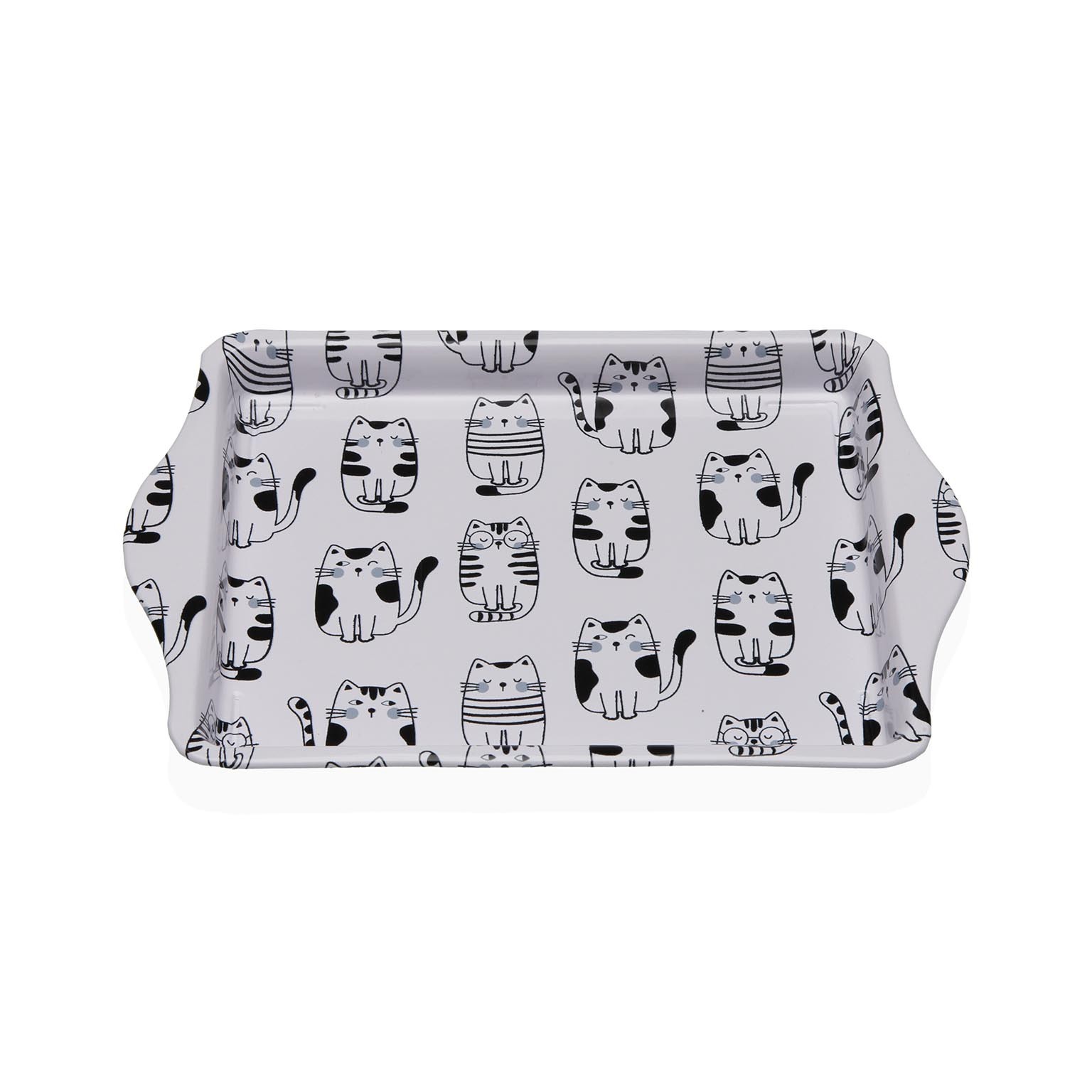 Su diseño moderno y lúdico, con ilustraciones de gatos en blanco y negro, la convierte en una opción versátil para servir aperitivos, bebidas o como pieza decorativa en mesas y estanterías.