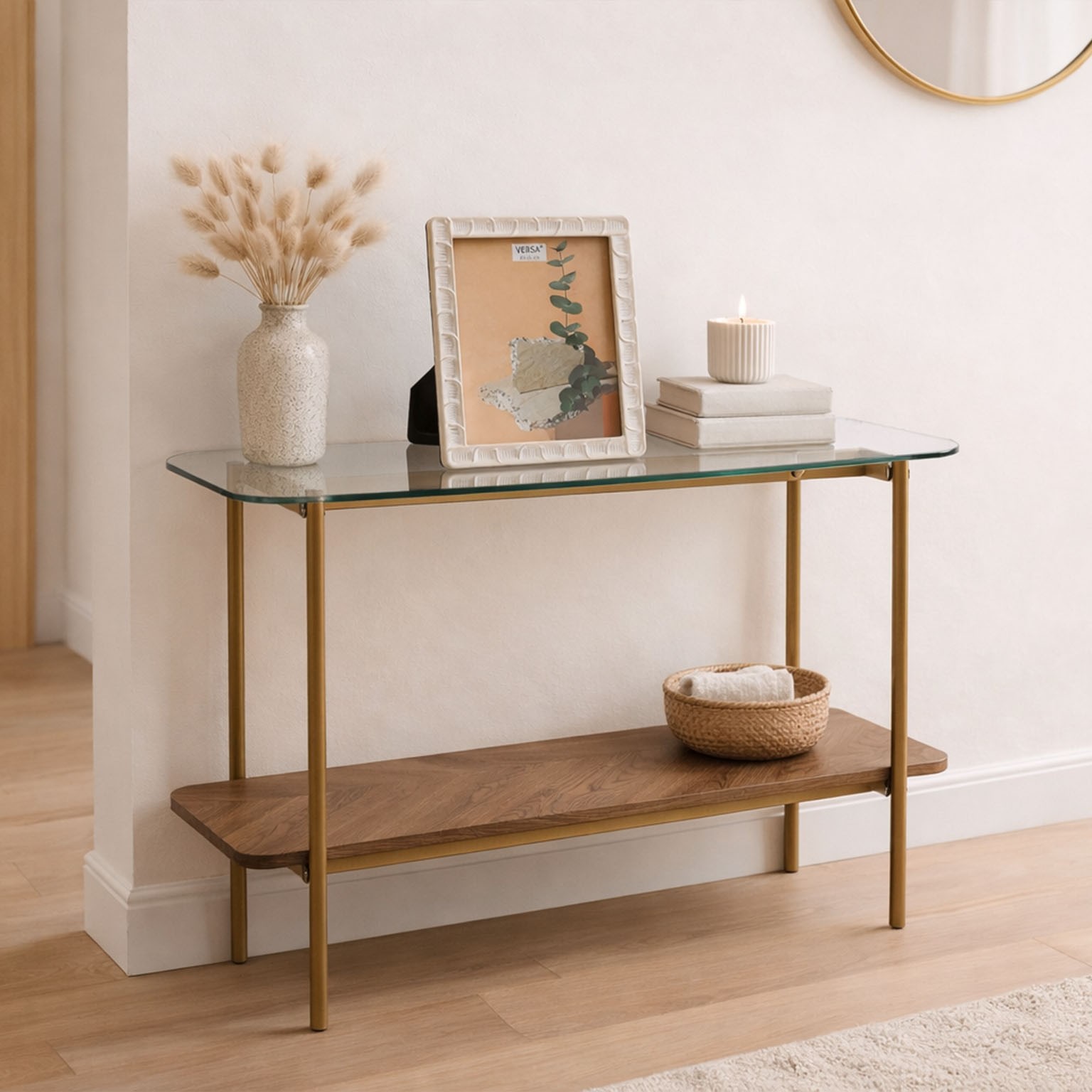 Con una estructura metálica en acabado dorado, su superficie de cristal templado de 8 mm y un estante inferior de madera de 15 mm aportan un toque moderno a cualquier espacio.