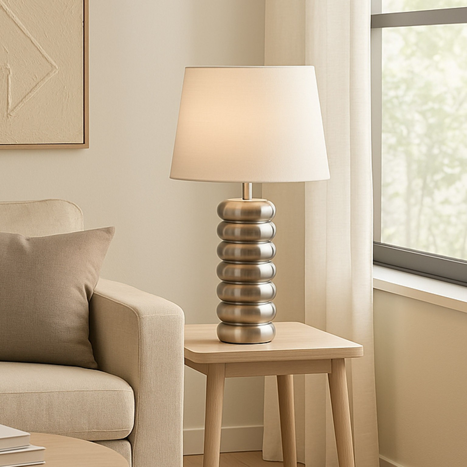 La lámpara de mesa Tarko plateado combina un diseño moderno con funcionalidad, ideal para espacios contemporáneos.