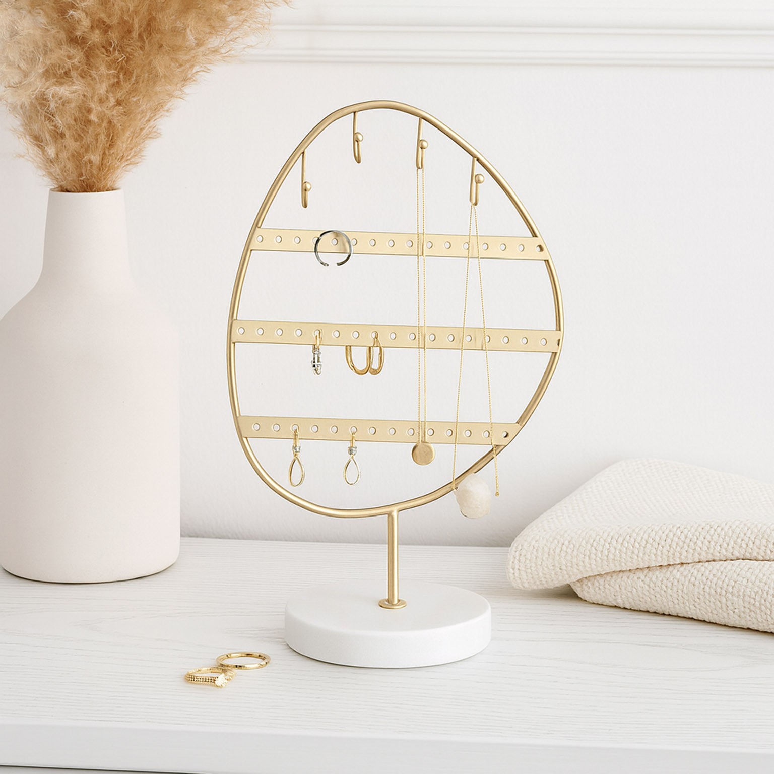 Ideal para exhibir y organizar collares, pulseras, aretes y anillos, se integra fácilmente en dormitorios, tocadores y espacios de trabajo, complementando diversos estilos de decoración.