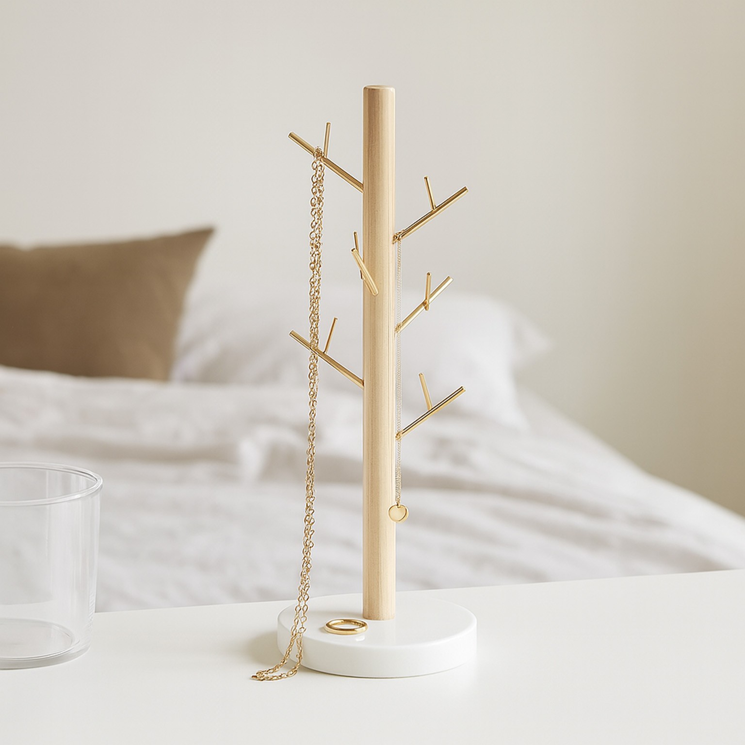 Con una altura de 27 cm y una base sólida, este joyero, fabricado en madera y metal, permite exhibir collares, pulseras, anillos y pendientes de manera ordenada.