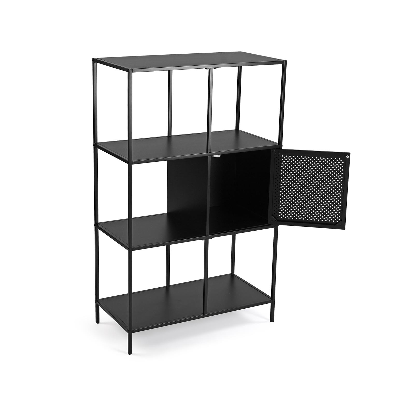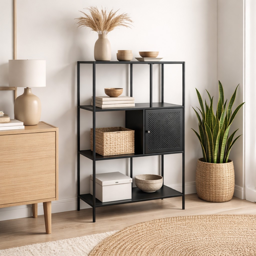 La estantería de 4 baldas negra con cajón es un mueble auxiliar funcional y elegante, ideal para optimizar el almacenamiento en espacios como salas de estar, oficinas o recibidores.