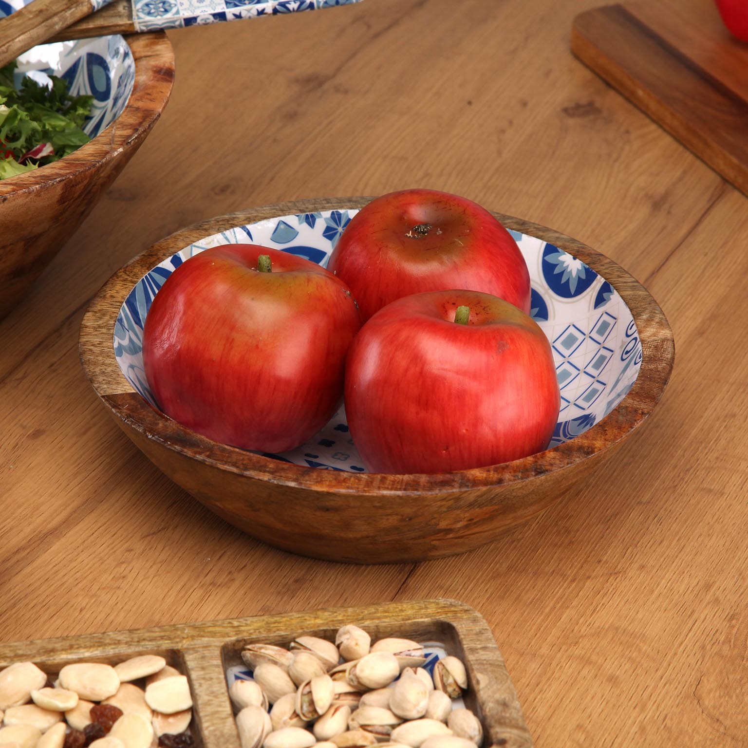 El bol grande esmaltado Azurita combina la calidez de la madera de mango con la elegancia de un interior esmaltado en tonos azules y blanco.