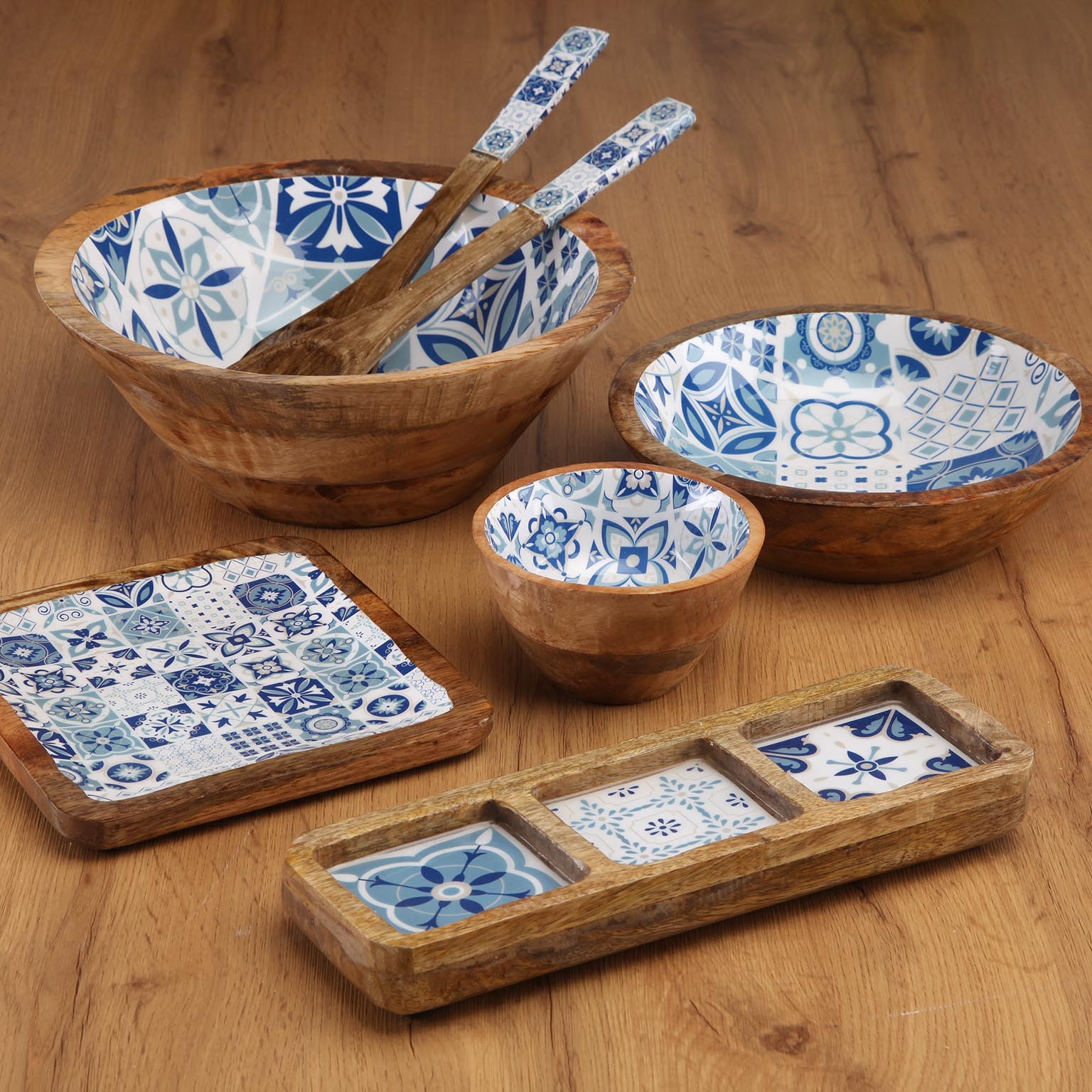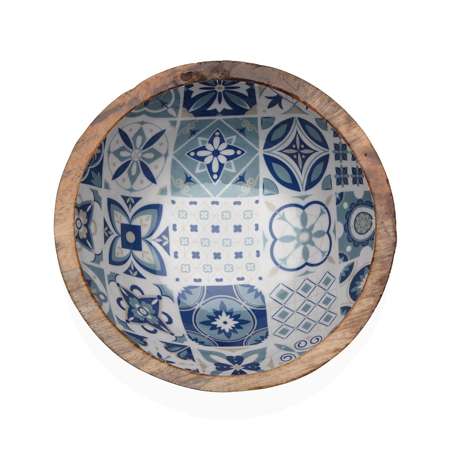 Su exterior de madera de mango aporta un toque natural, mientras que el interior de porcelana decorado en tonos azules añade un estilo mediterráneo y artesanal.