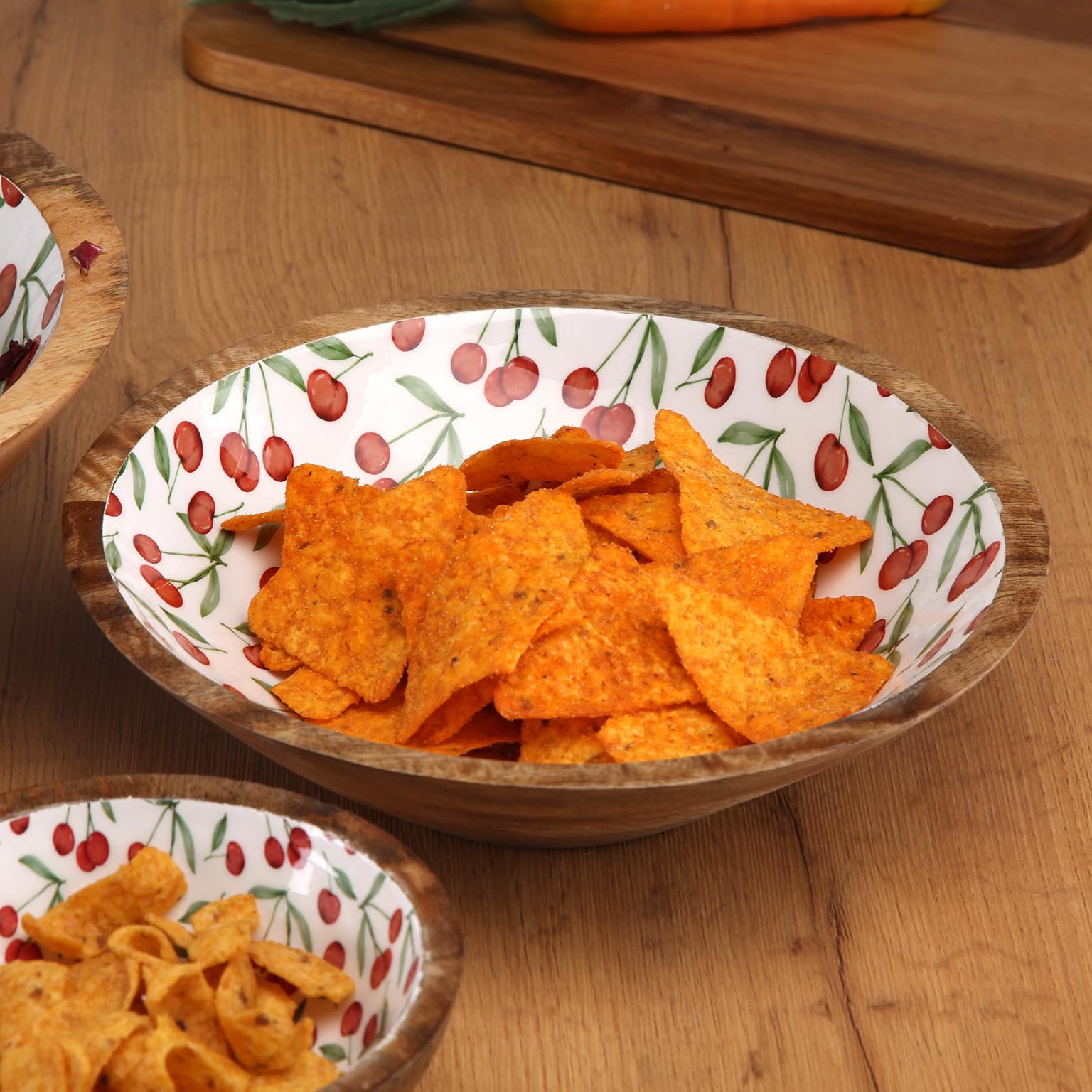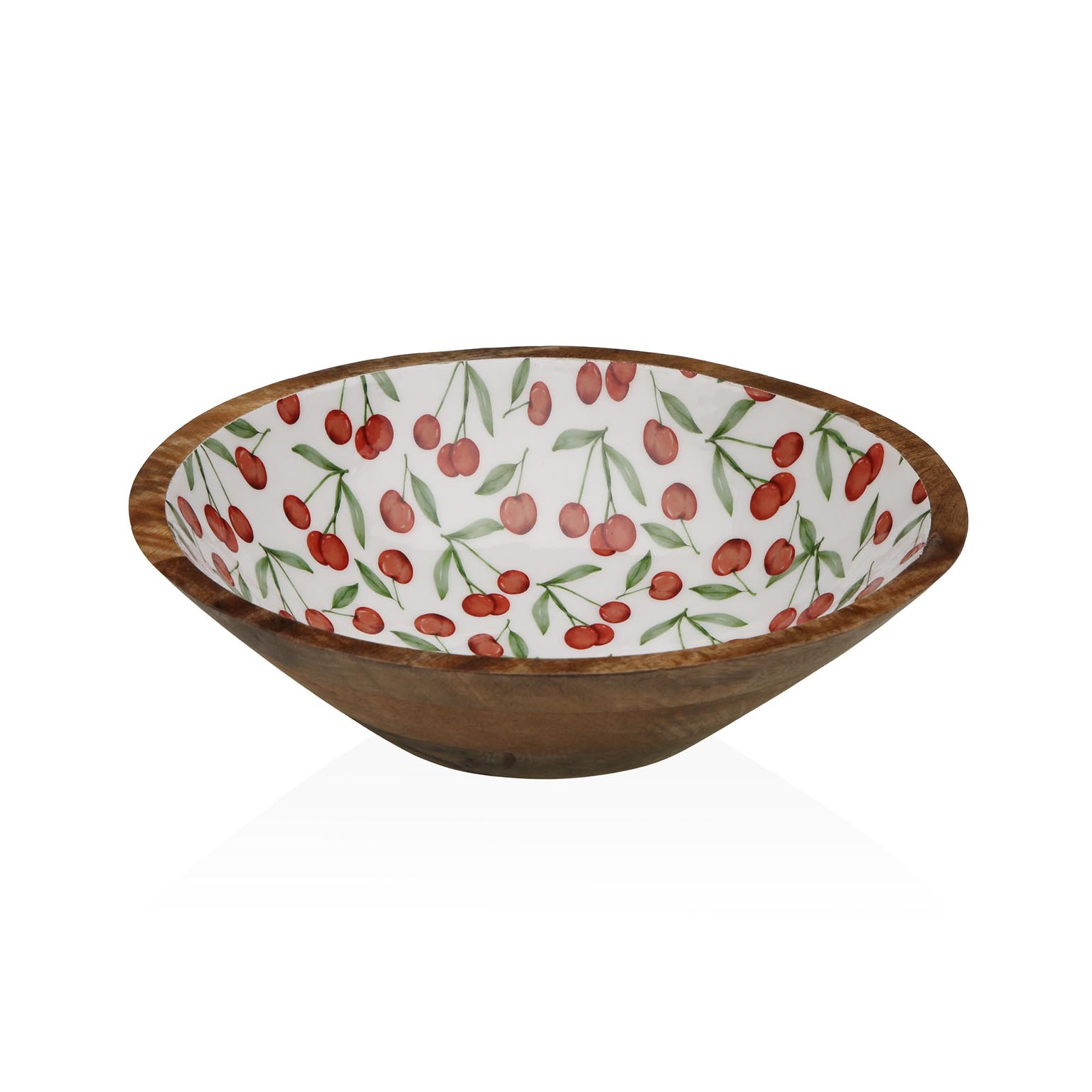 El bol grande esmaltado Cherries combina la calidez de la madera de mango con un interior esmaltado que presenta un encantador diseño de cerezas.