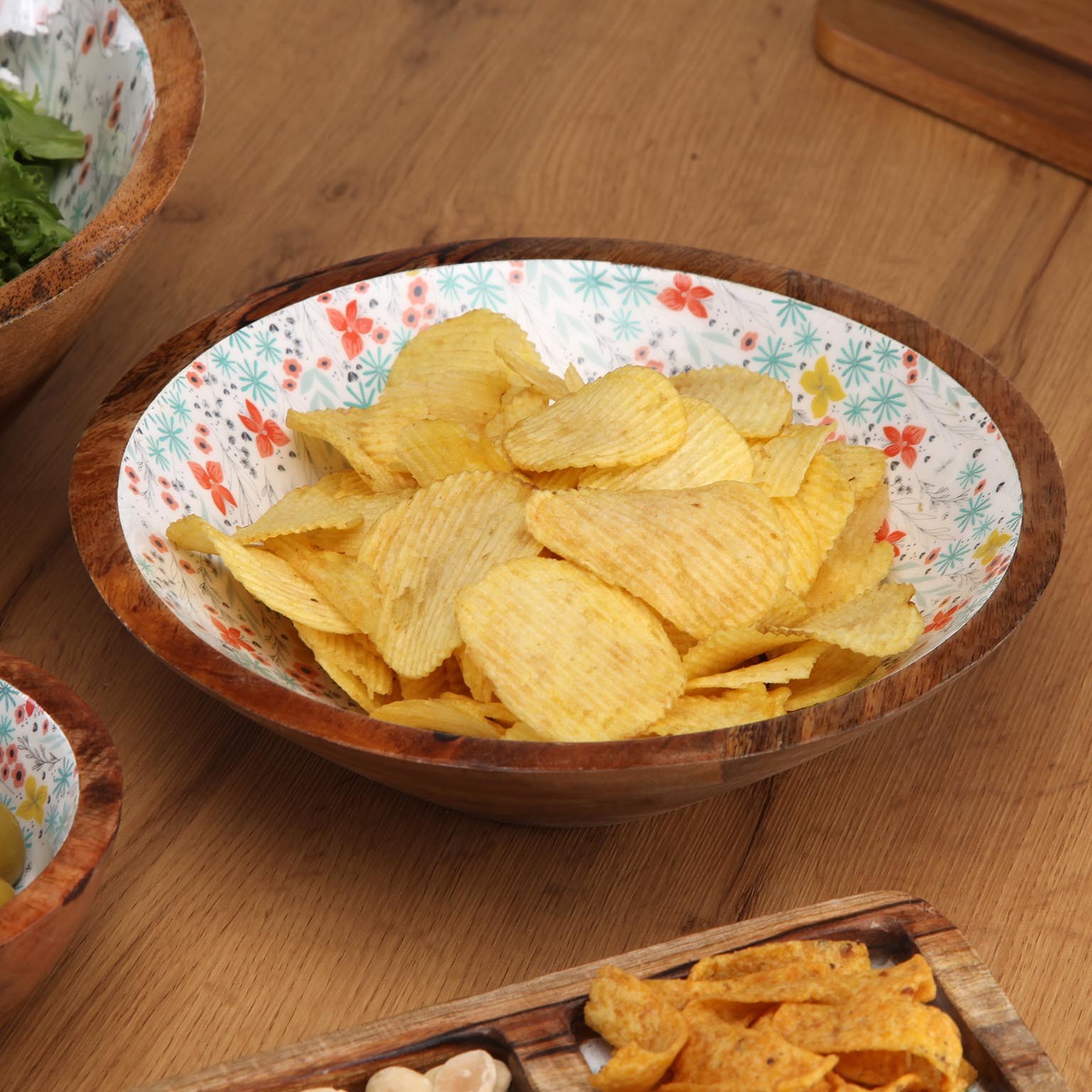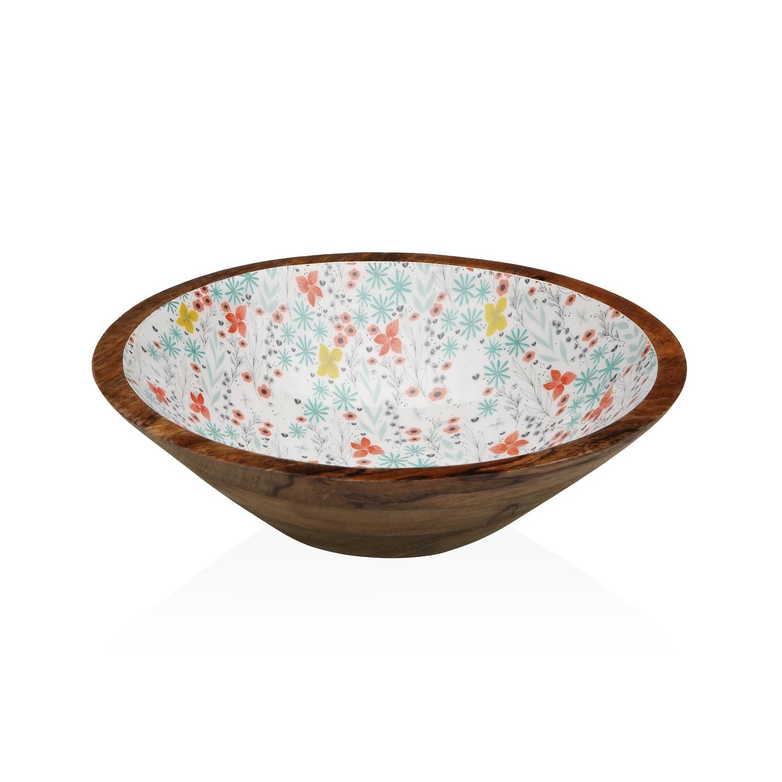 El bol grande esmaltado Fiorella combina la calidez de la madera de mango con la elegancia de un interior esmaltado en blanco, adornado con un vibrante diseño floral en tonos rojo, amarillo, verde y azul.