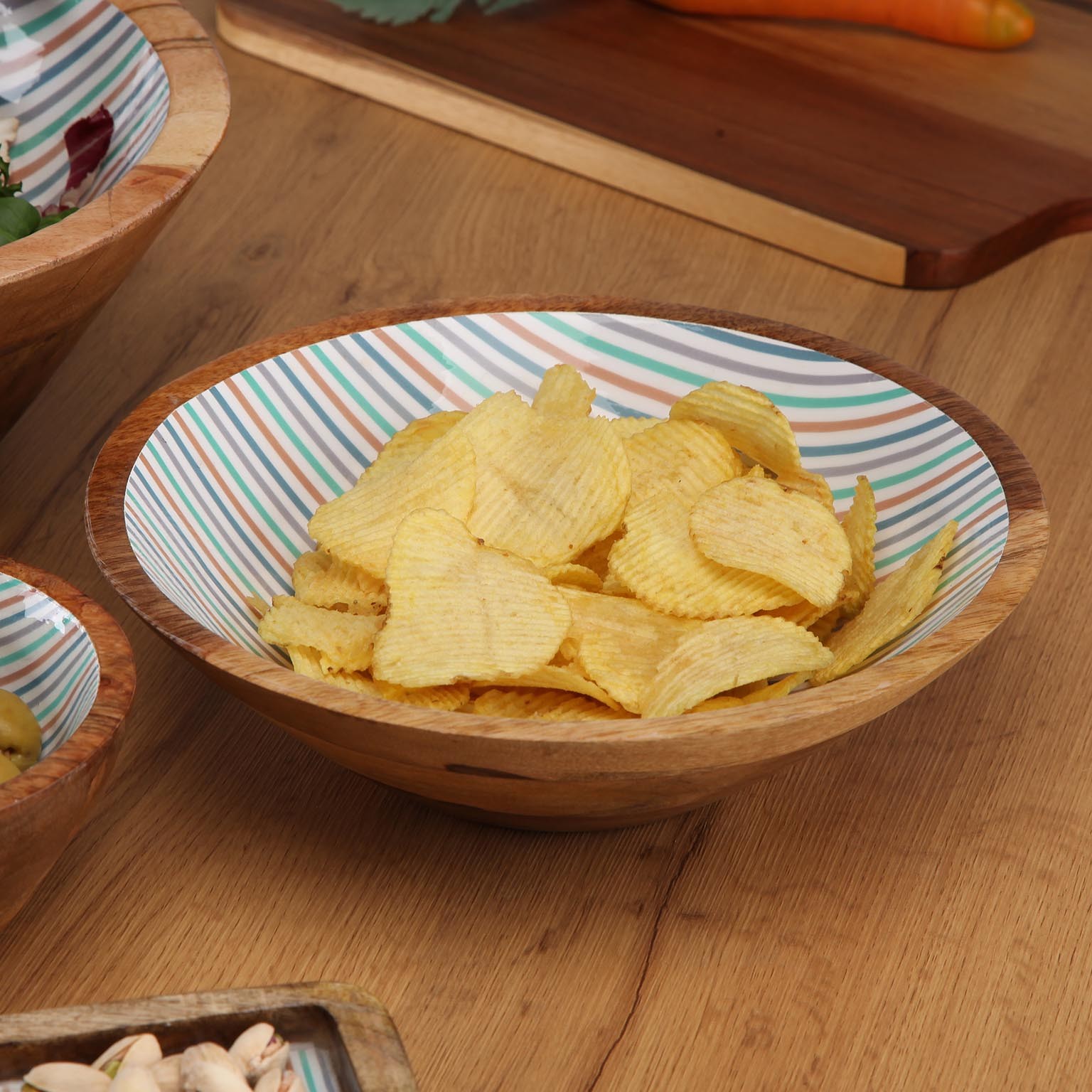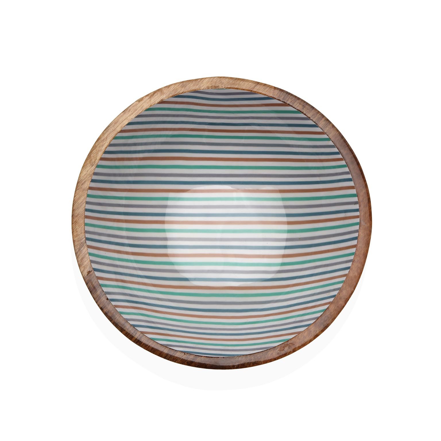 Fabricado en madera de mango y con un interior esmaltado en blanco decorado con rayas en tonos azul, verde y marrón, aporta un toque moderno con influencias étnicas.