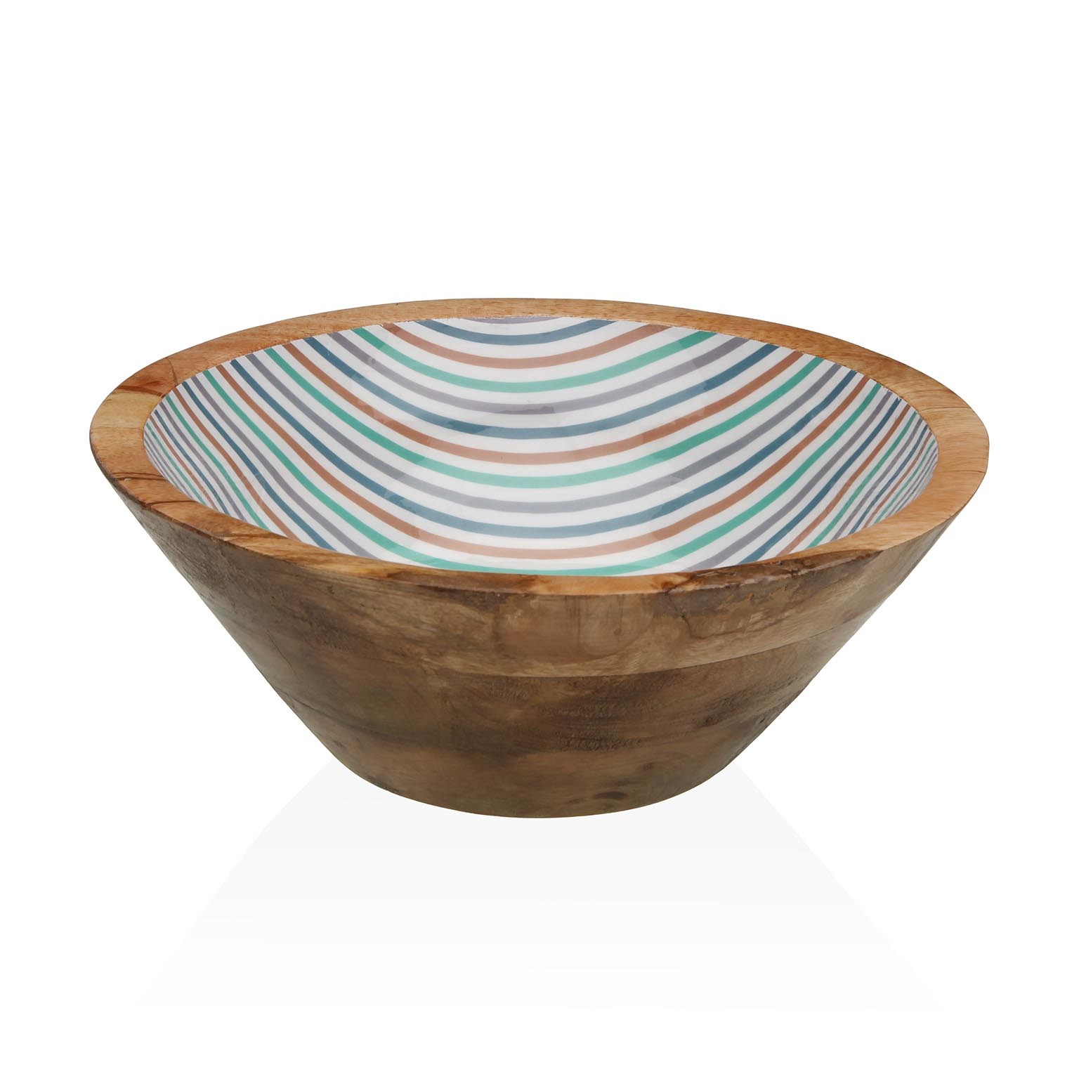 El bol grande rayas de 30 cm de diámetro, fabricado en madera de mango y porcelana, destaca por su diseño rústico y moderno.