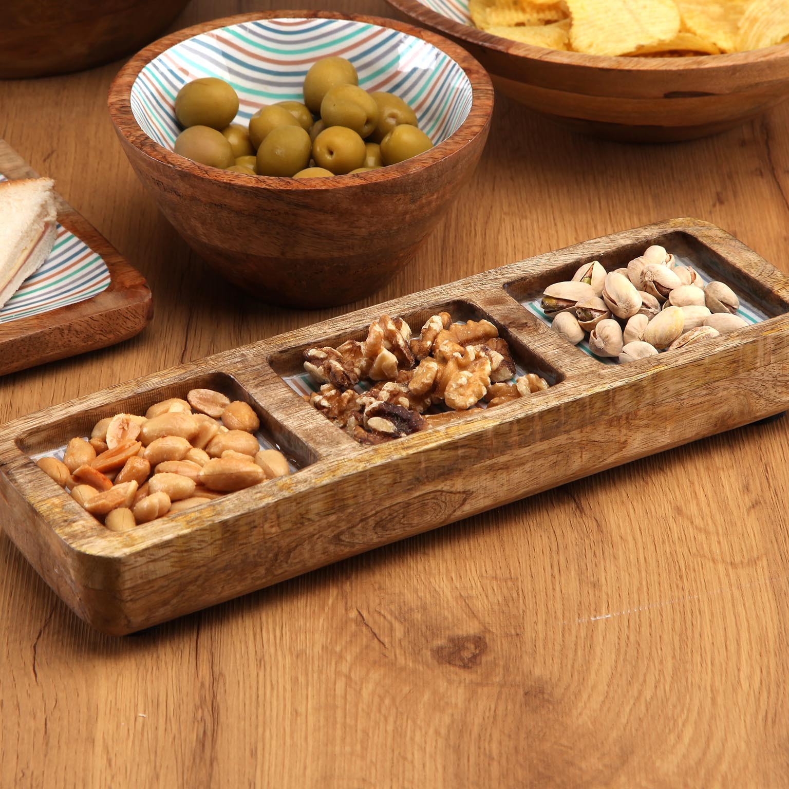 La fuente tres compartimentos rayas, elaborada en madera de mango, combina funcionalidad y estilo en un diseño rústico con un toque moderno.