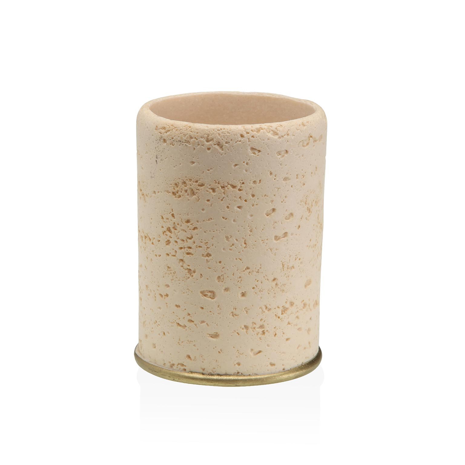 El portacepillos Moira Arena es un accesorio funcional y decorativo para el baño, diseñado en resina con un elegante acabado texturizado en tonos arena y un detalle dorado en la base.
