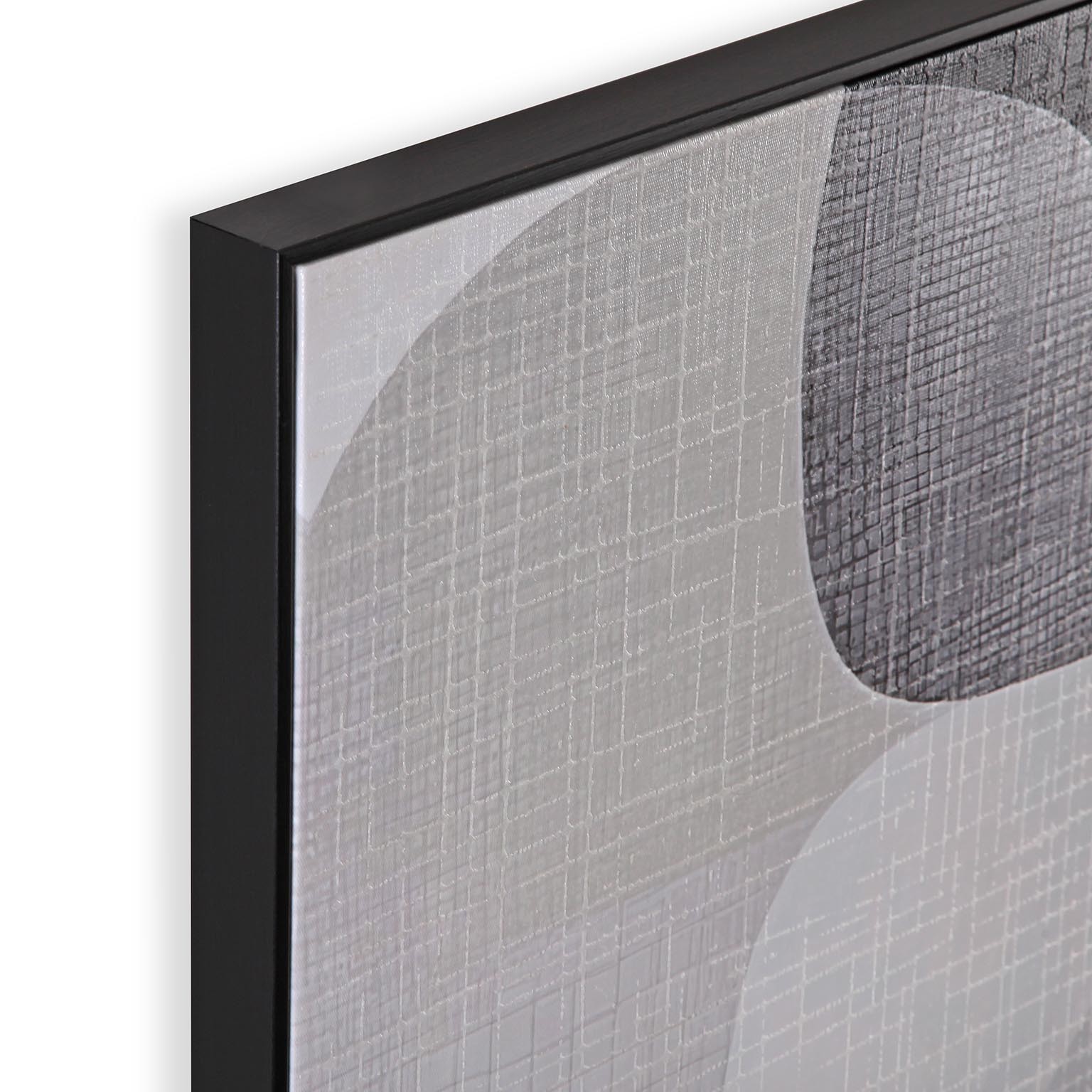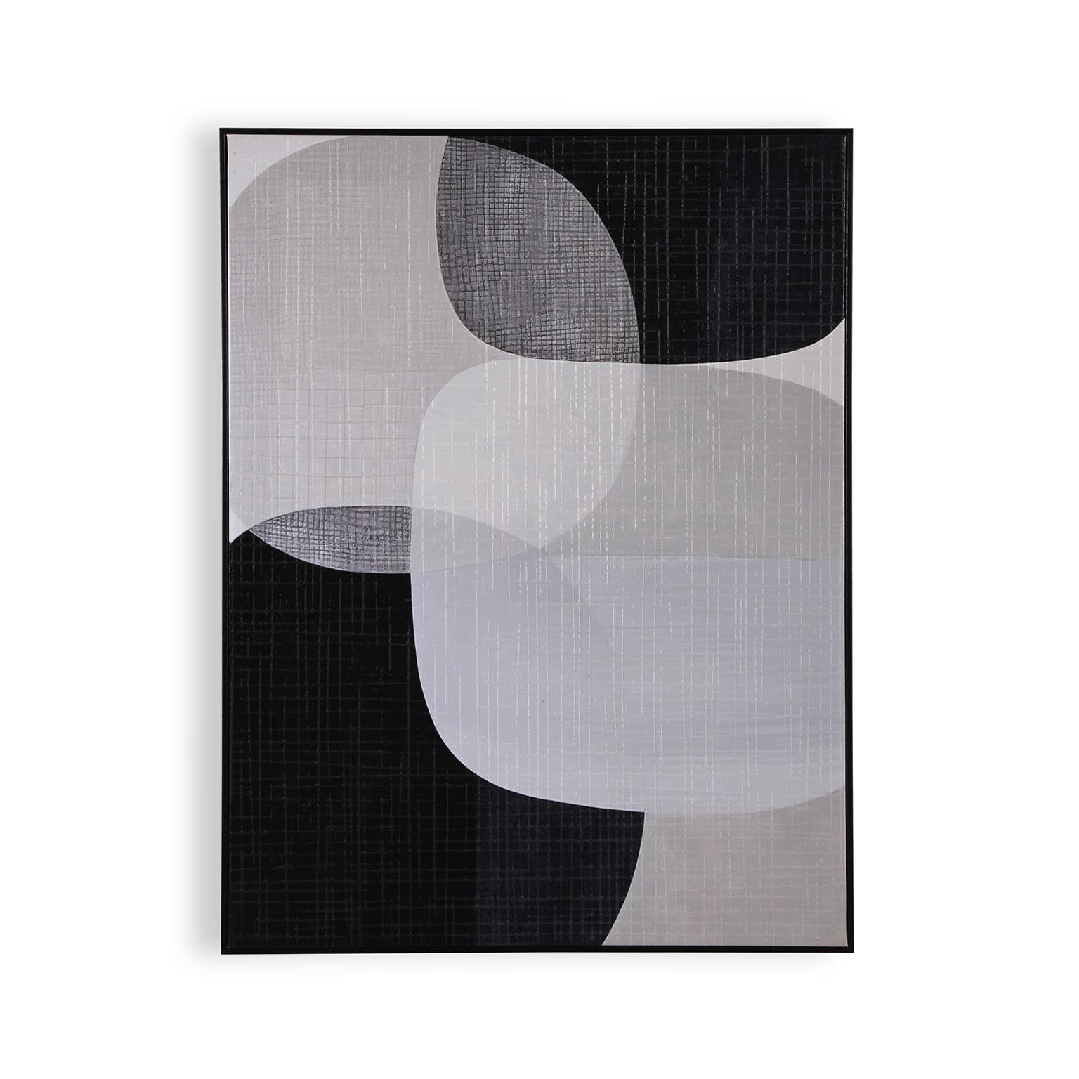 Fabricado en lienzo con un marco de madera, presenta un diseño geométrico en tonos neutros como blanco, gris y negro.