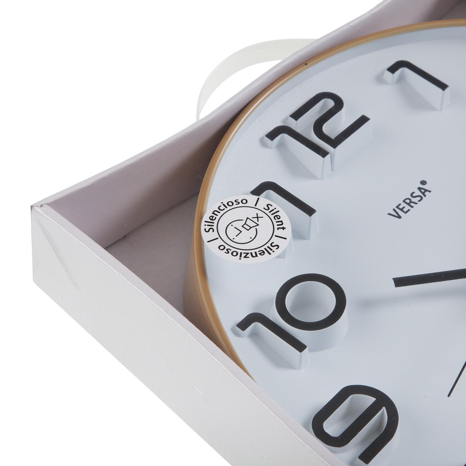 Fabricado en plástico y cristal, su diseño moderno y minimalista presenta una esfera blanca con números y manecillas en negro, complementada por un bisel dorado.