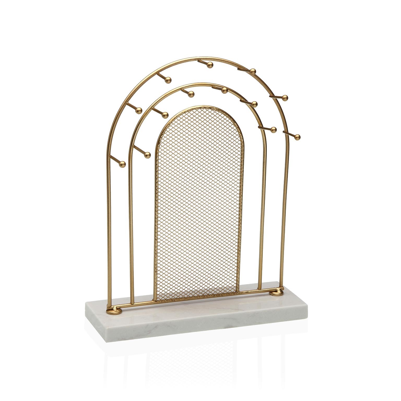 El colgador de joyas es un accesorio funcional y estético que combina una estructura metálica dorada con una base de mármol blanco, aportando un toque moderno y minimalista a cualquier espacio.