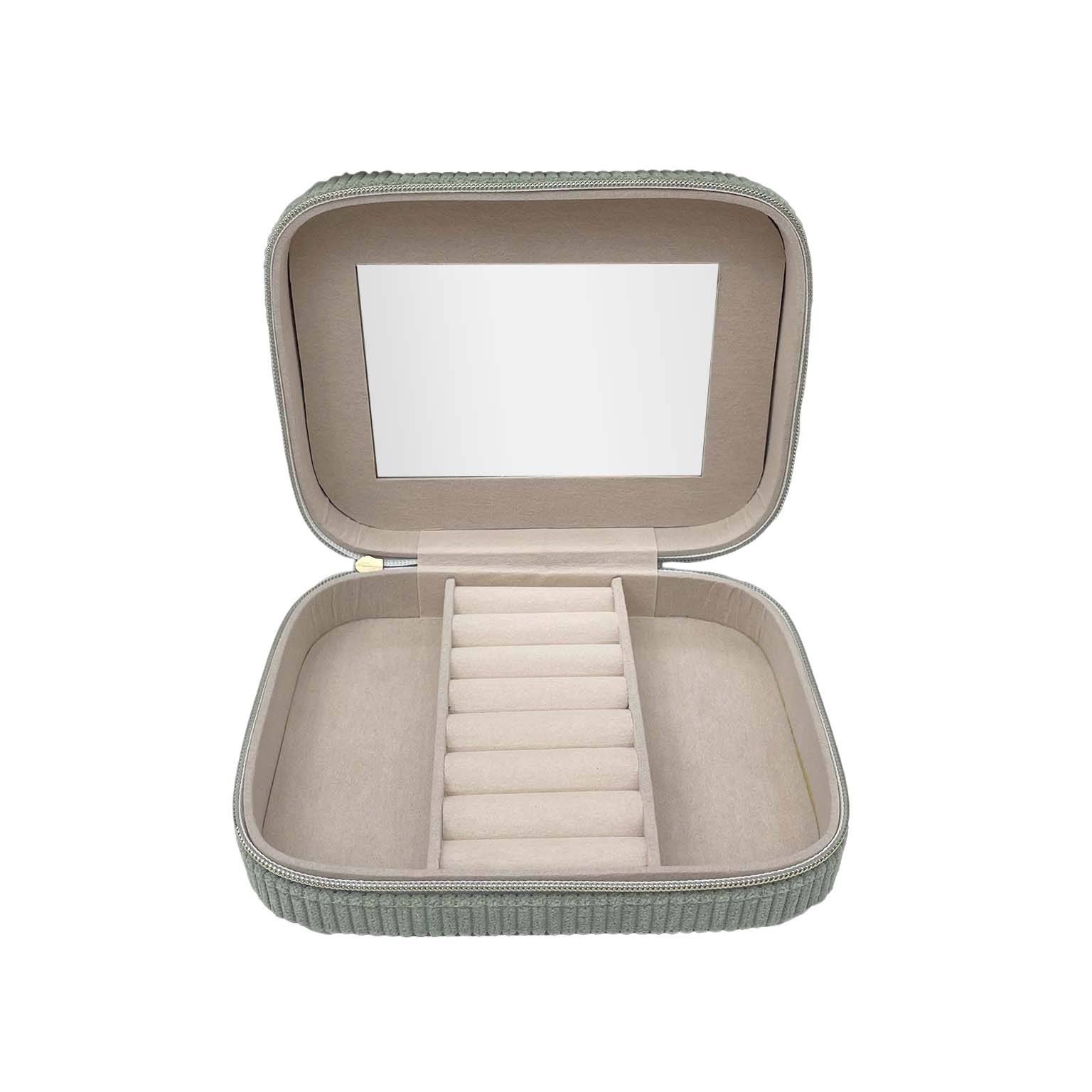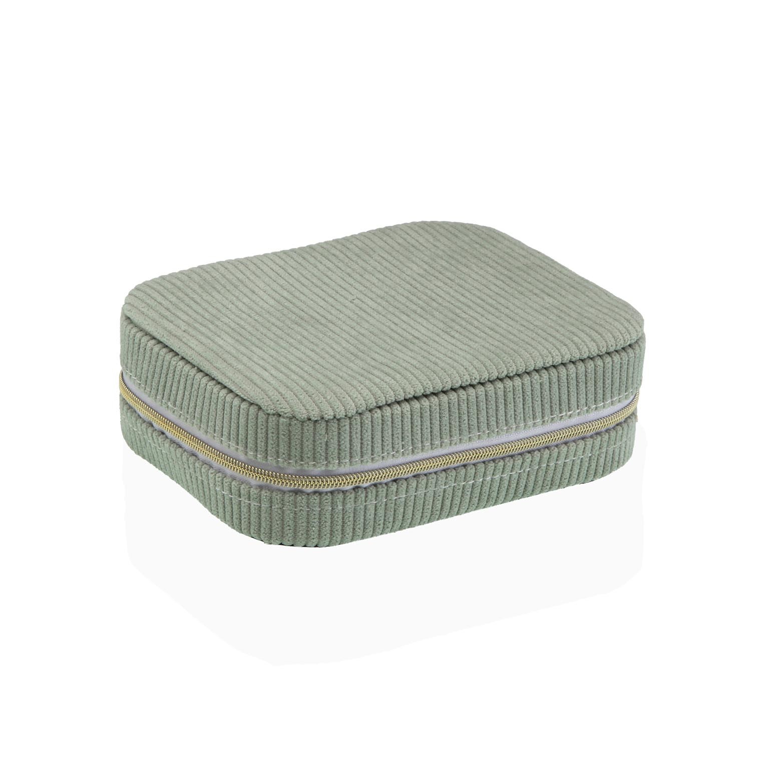 El joyero de pana verde menta es una pieza funcional y decorativa que combina estilo moderno con un diseño minimalista.