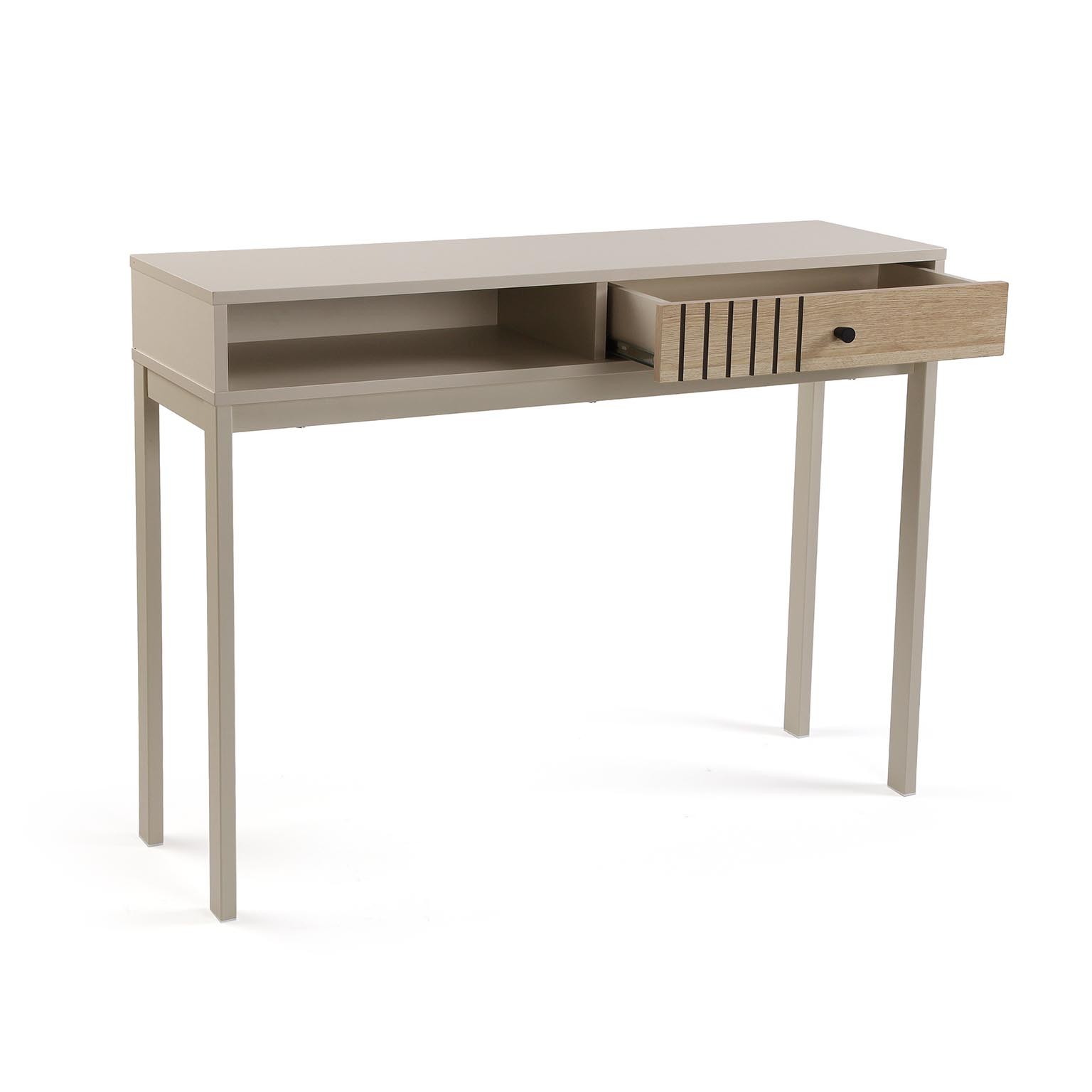 Fabricada en melamina y metal, presenta un acabado en tonos neutros que se adapta a diversos estilos decorativos.