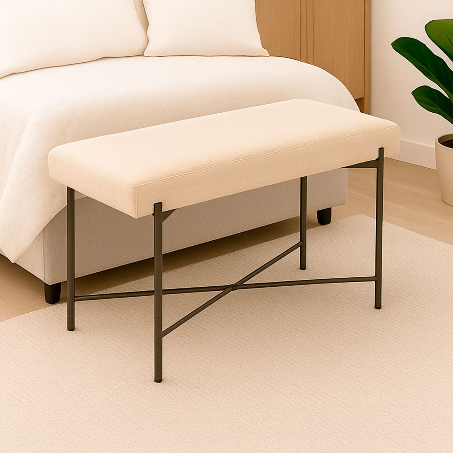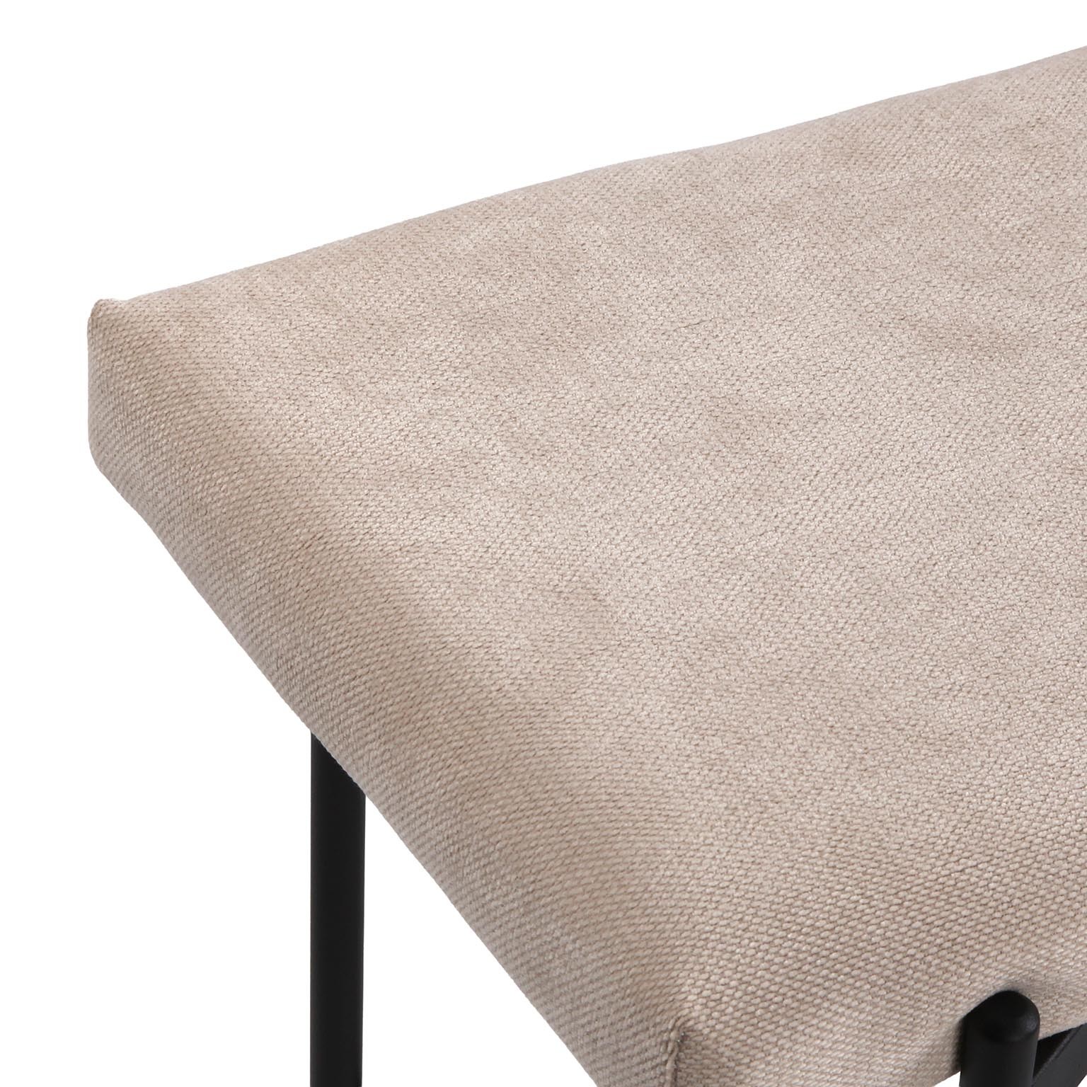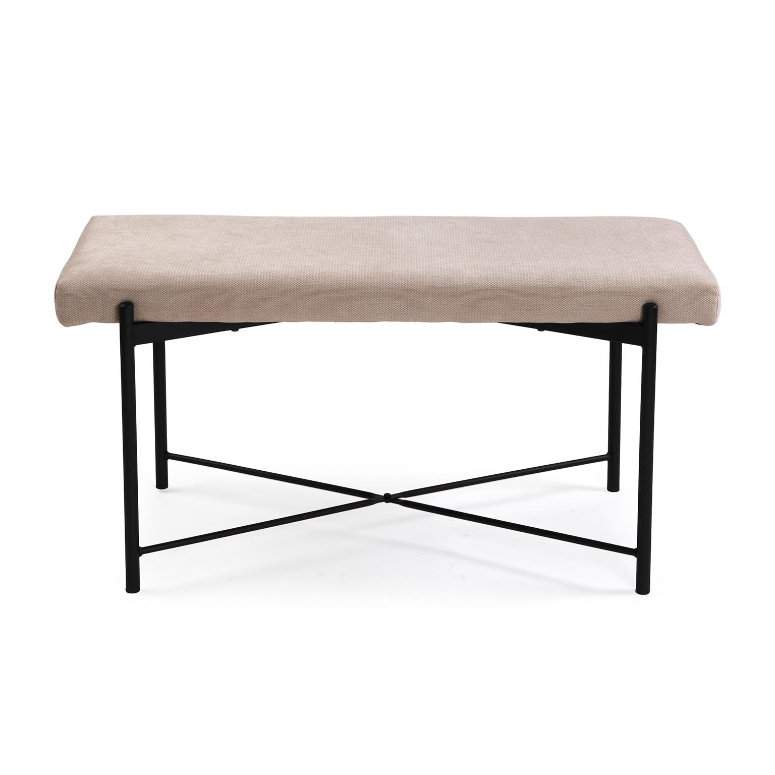Con una estructura de acero y un tapizado en suave textil beige, este asiento de 46 cm de altura y 91 cm de largo se adapta a diversos entornos.