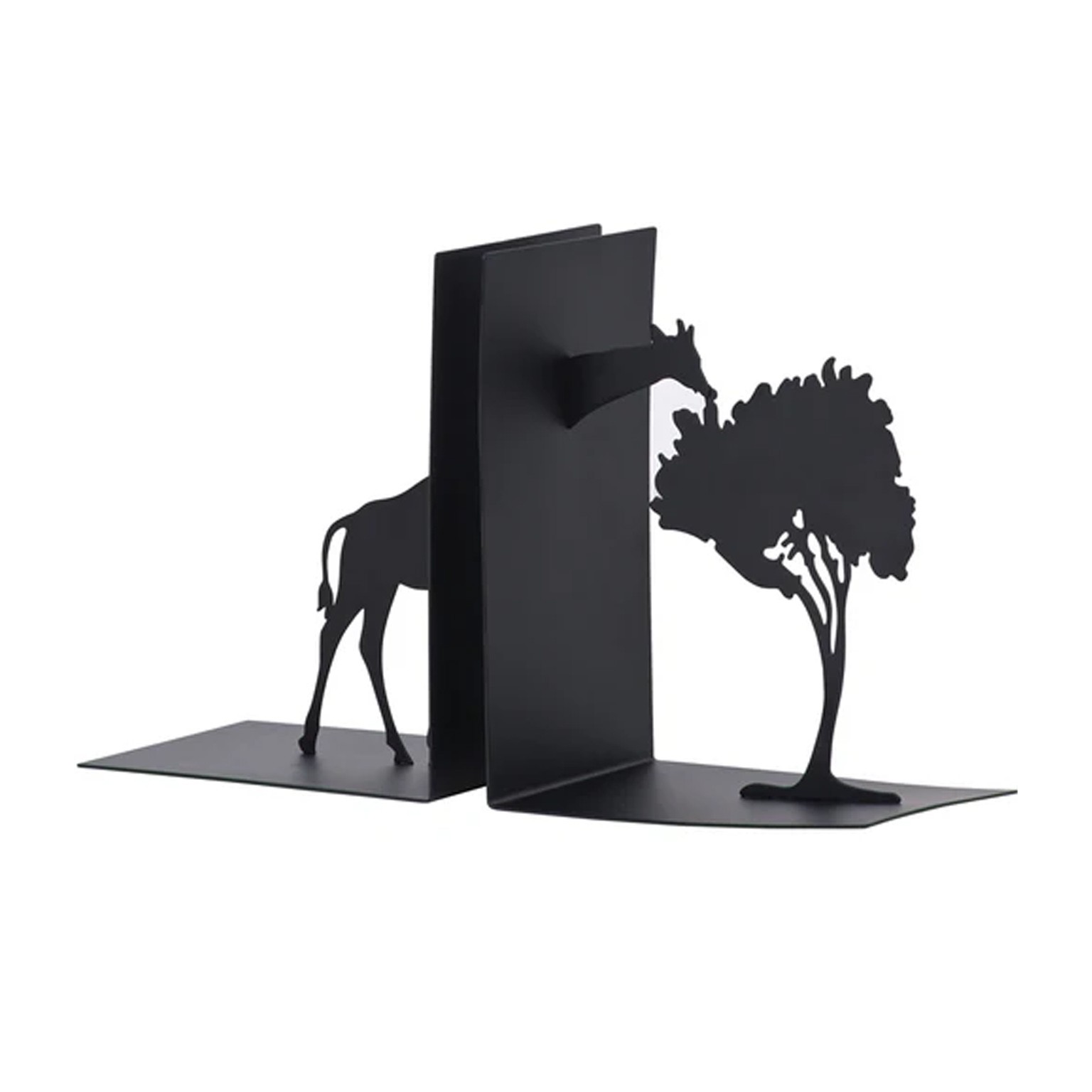Fabricado en metal negro, su diseño minimalista destaca la forma de la jirafa y un árbol, aportando un toque distintivo a cualquier estantería o escritorio.