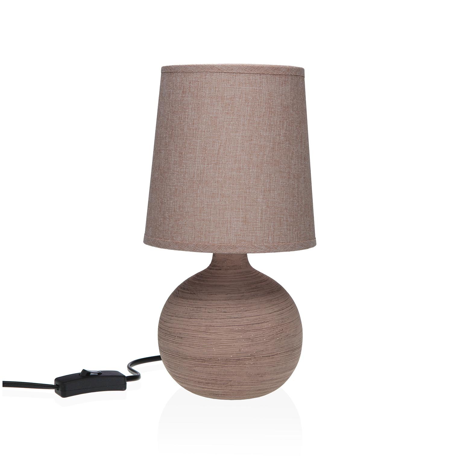 Con una base de cerámica en tonos marrones y una tulipa de tela beige, su diseño rústico con toques modernos se adapta a mesas de noche, auxiliares o escritorios.