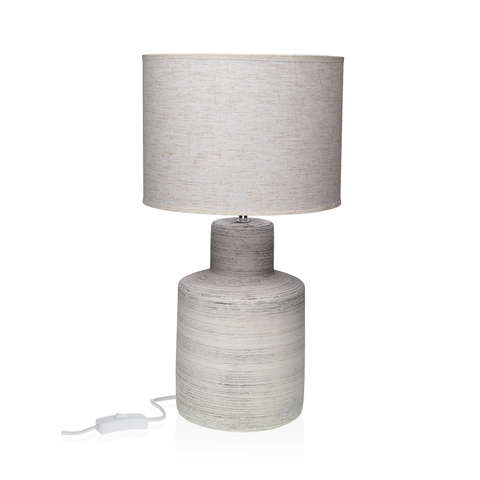 Fabricada en cerámica con una elegante tulipa de tela, sus dimensiones de 55,5 cm de altura y 20 cm de ancho la hacen ideal para mesas de noche, escritorios o mesas auxiliares.