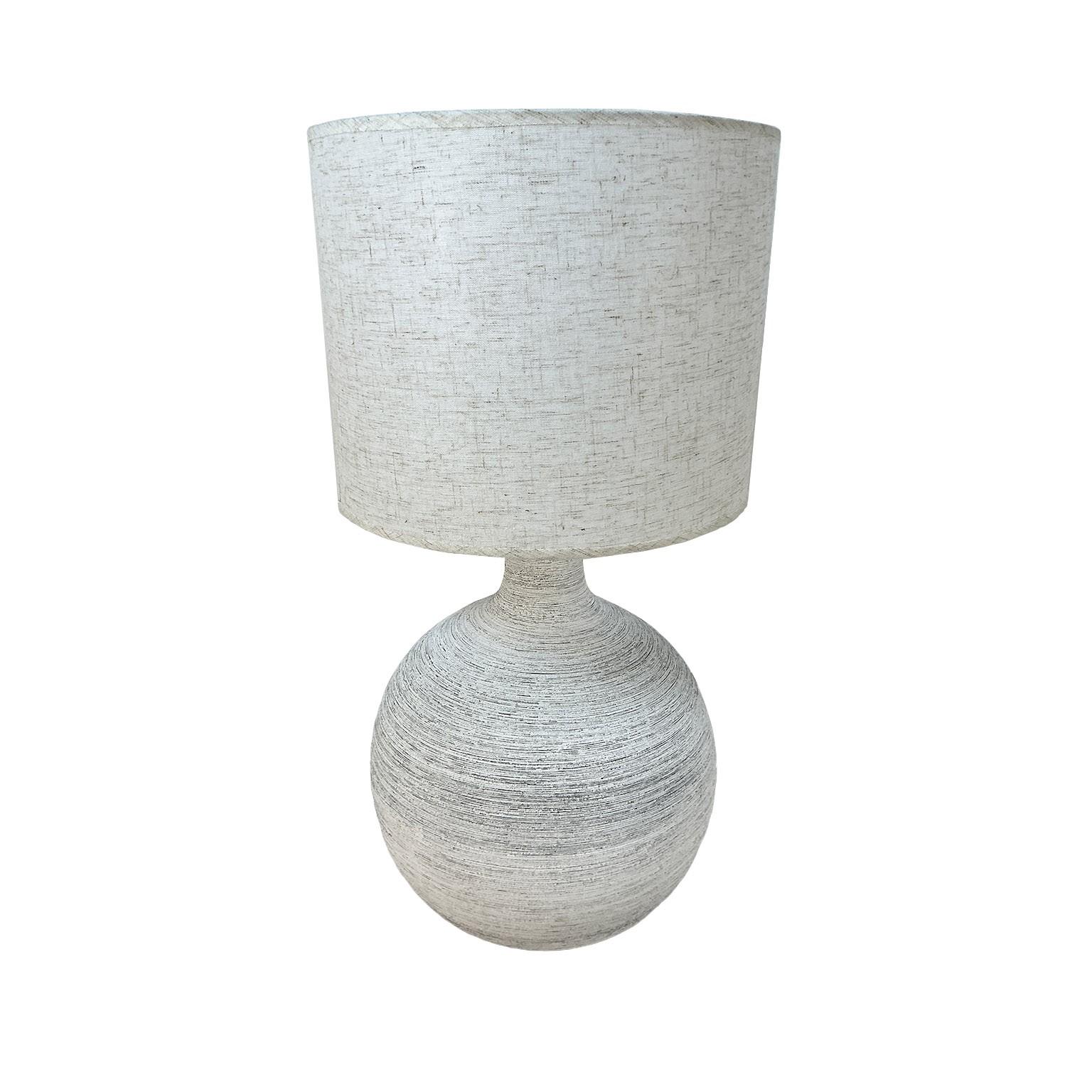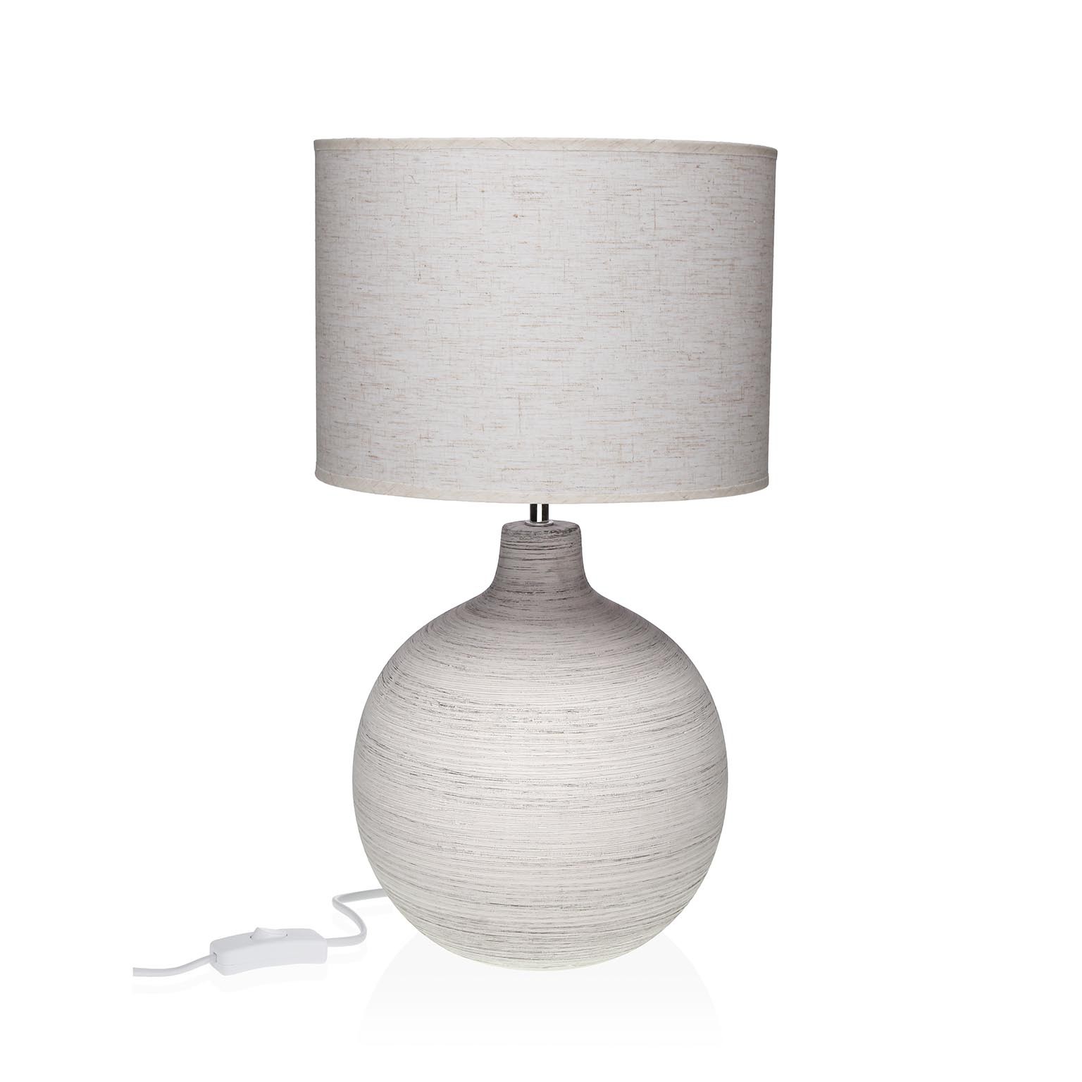 La lámpara de mesa Neo combina un diseño moderno y minimalista con materiales de cerámica y una tulipa de tela en tonos neutros, como blanco y beige.