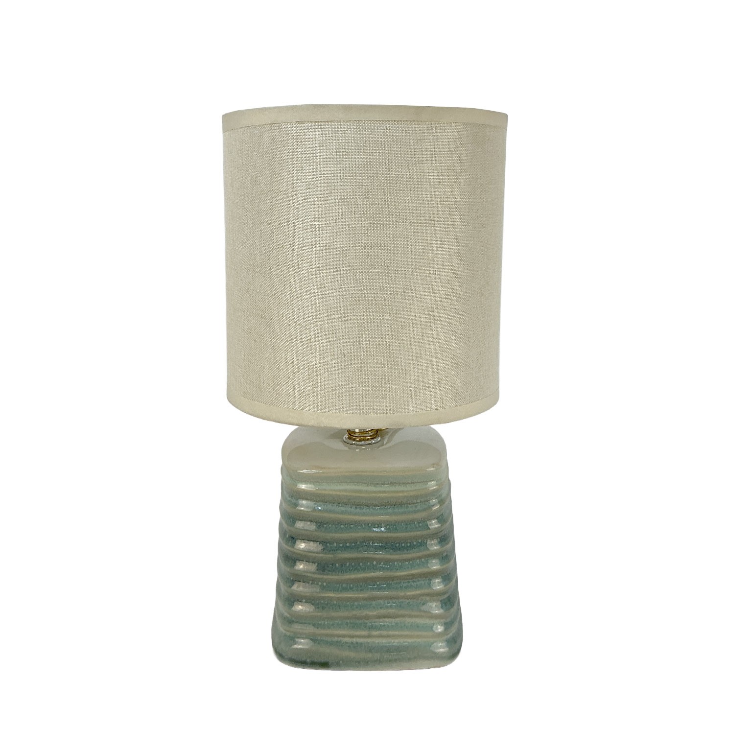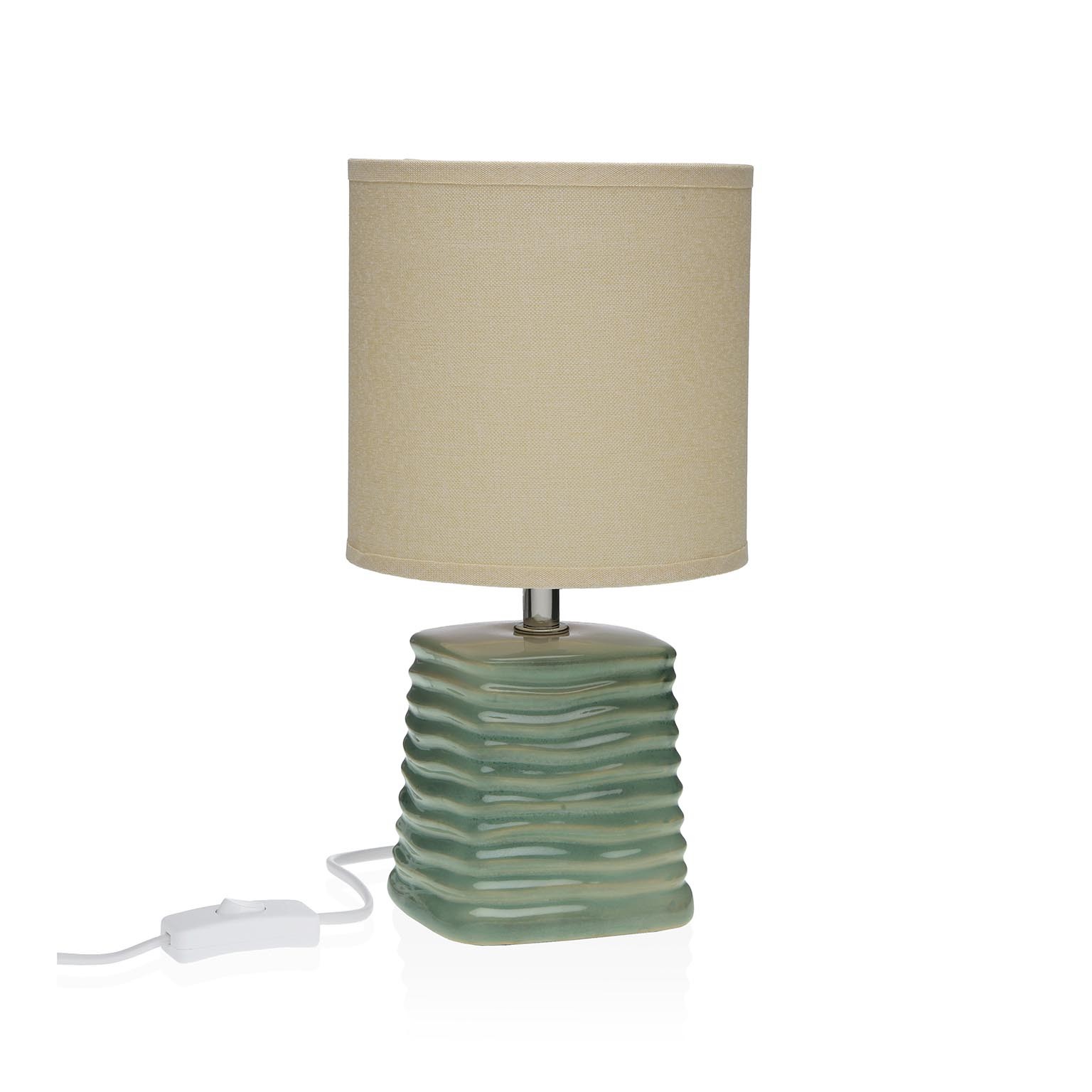 Su base de cerámica en un atractivo tono verde aporta un toque moderno, mientras que la tulipa de tela en tonos neutros complementa su diseño contemporáneo.