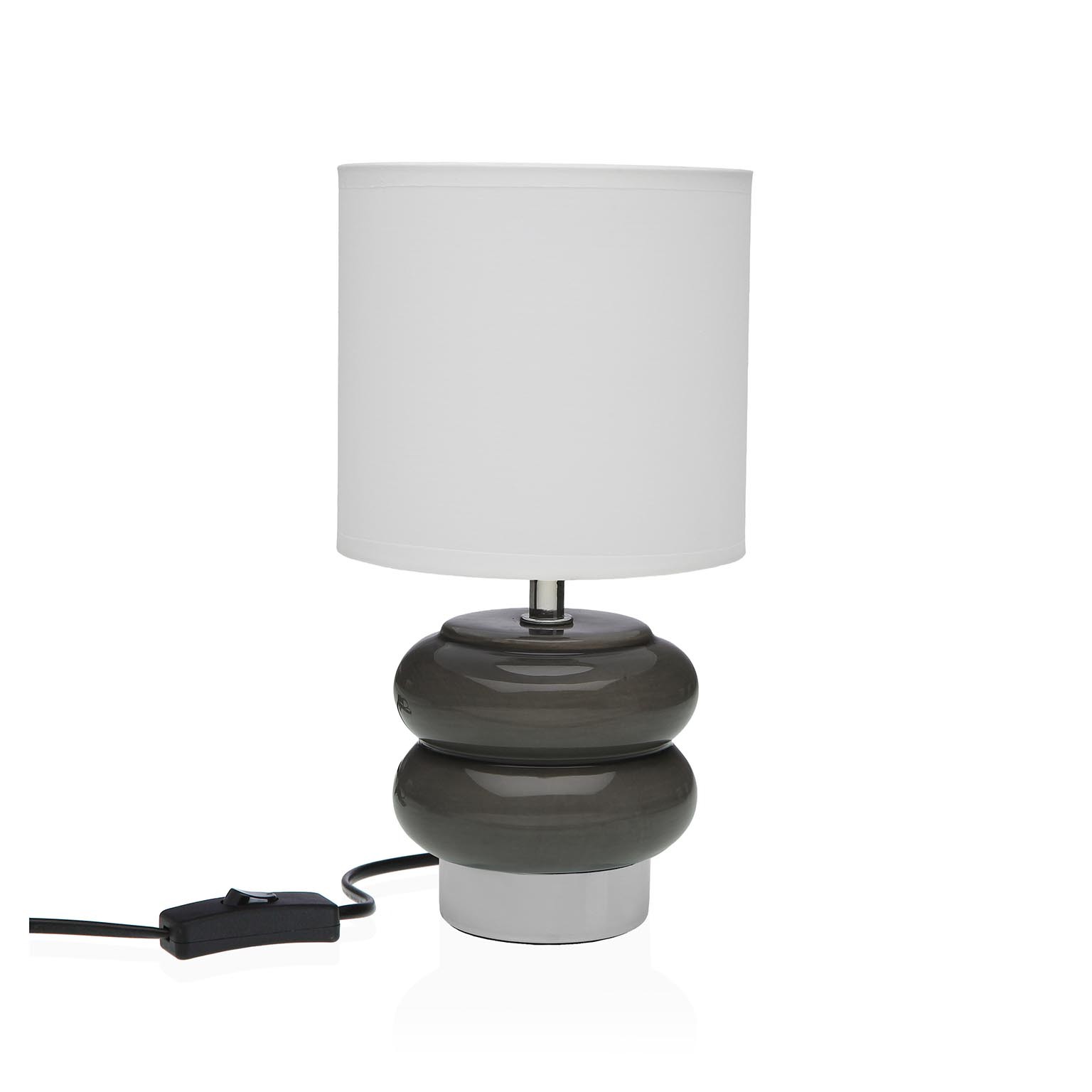 Con una base de cerámica en un elegante tono gris y una tulipa de tela blanca, su diseño se adapta a mesas de noche, auxiliares o escritorios.
