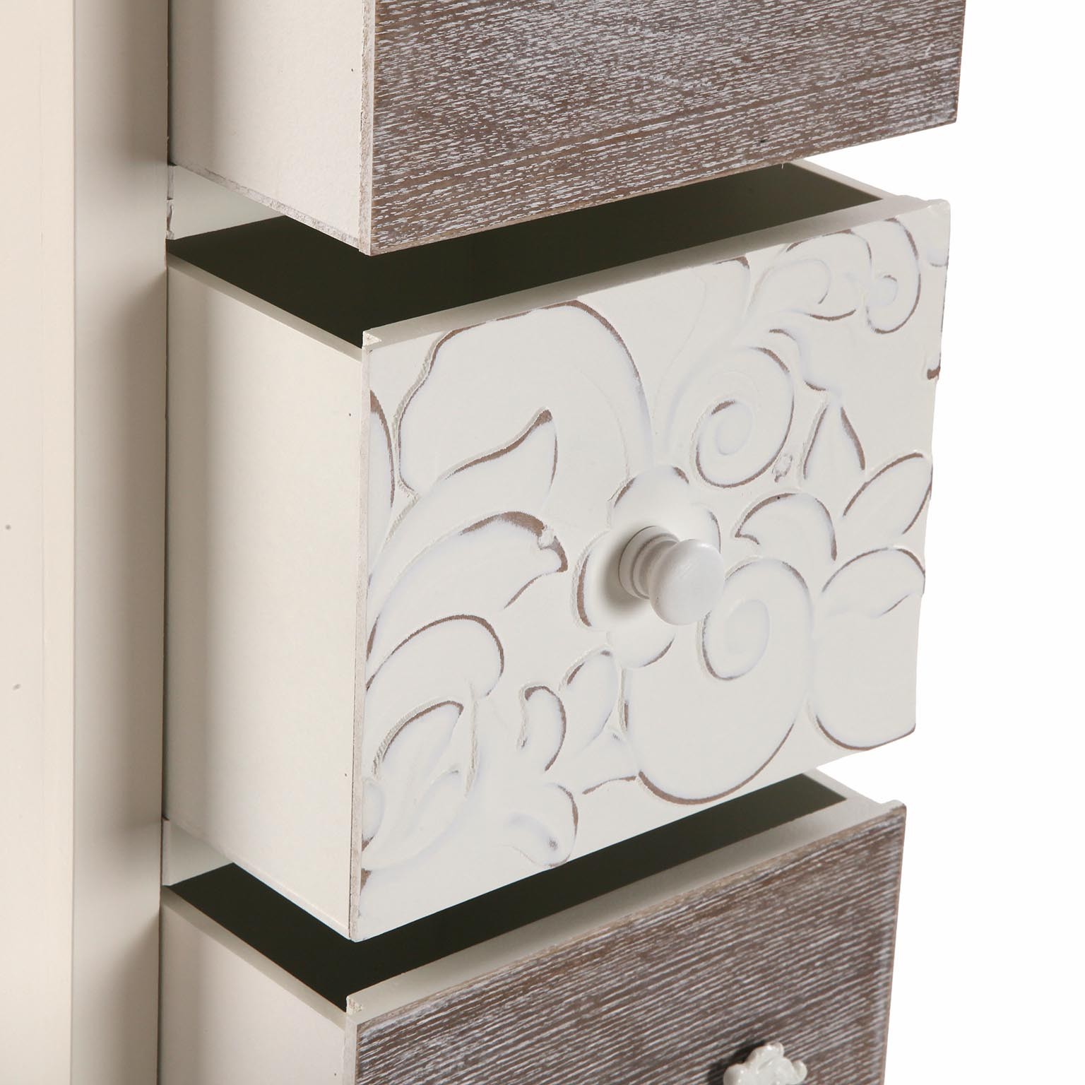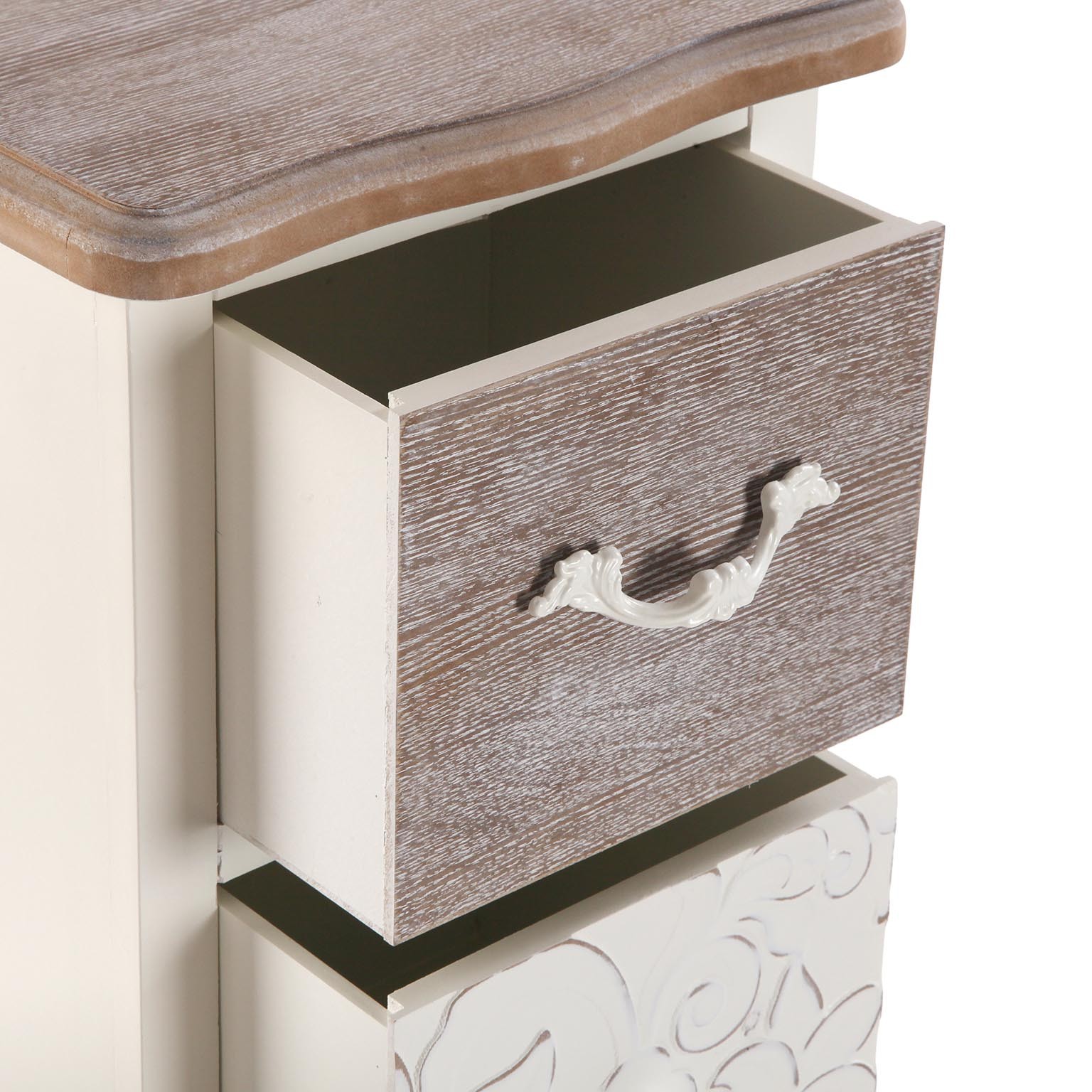 Fabricada en madera MDF y pino, presenta un acabado en blanco con detalles en marrón que realzan su diseño vintage.