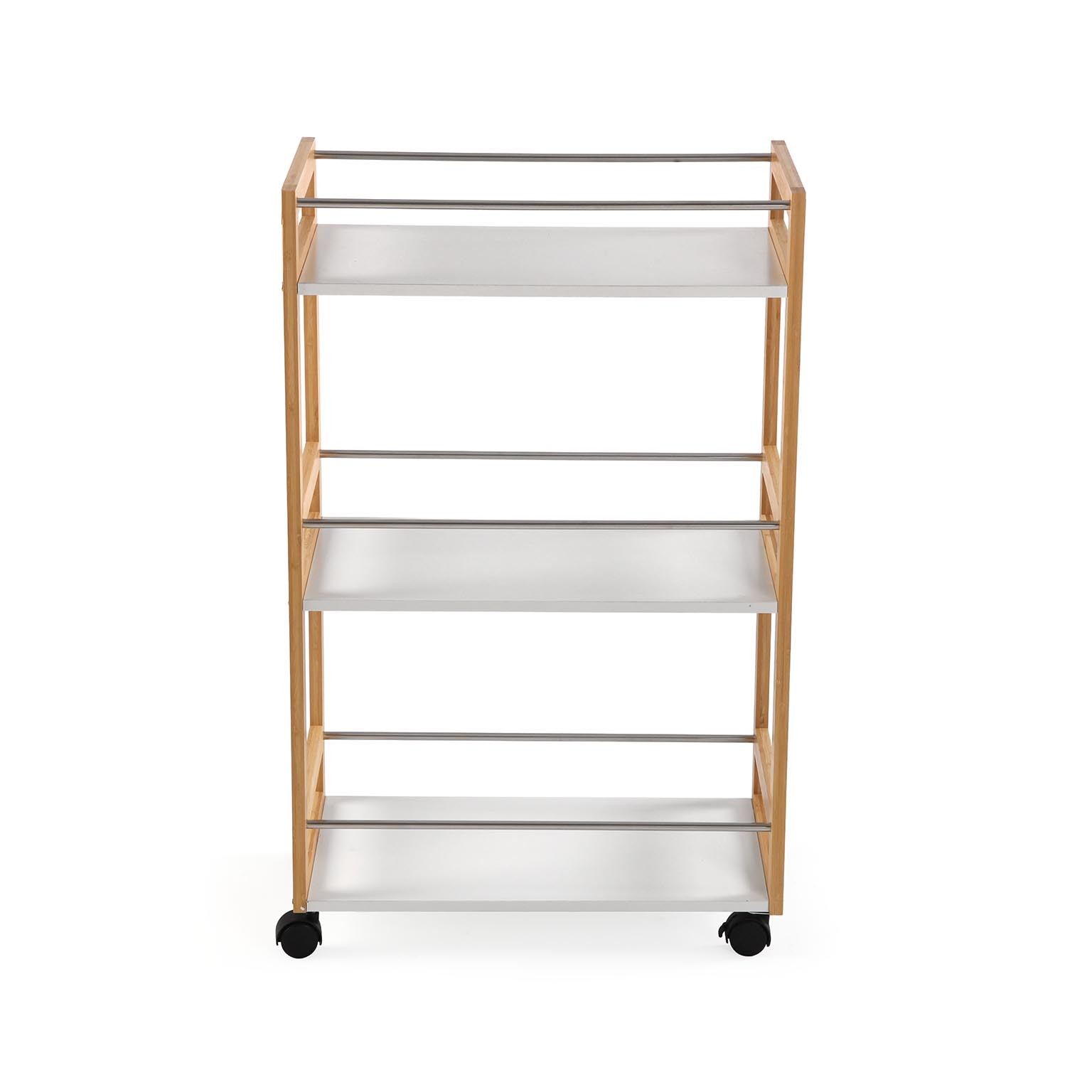 El carro con ruedas de 3 baldas en blanco y bambú es una solución funcional y elegante para el almacenamiento en la cocina.