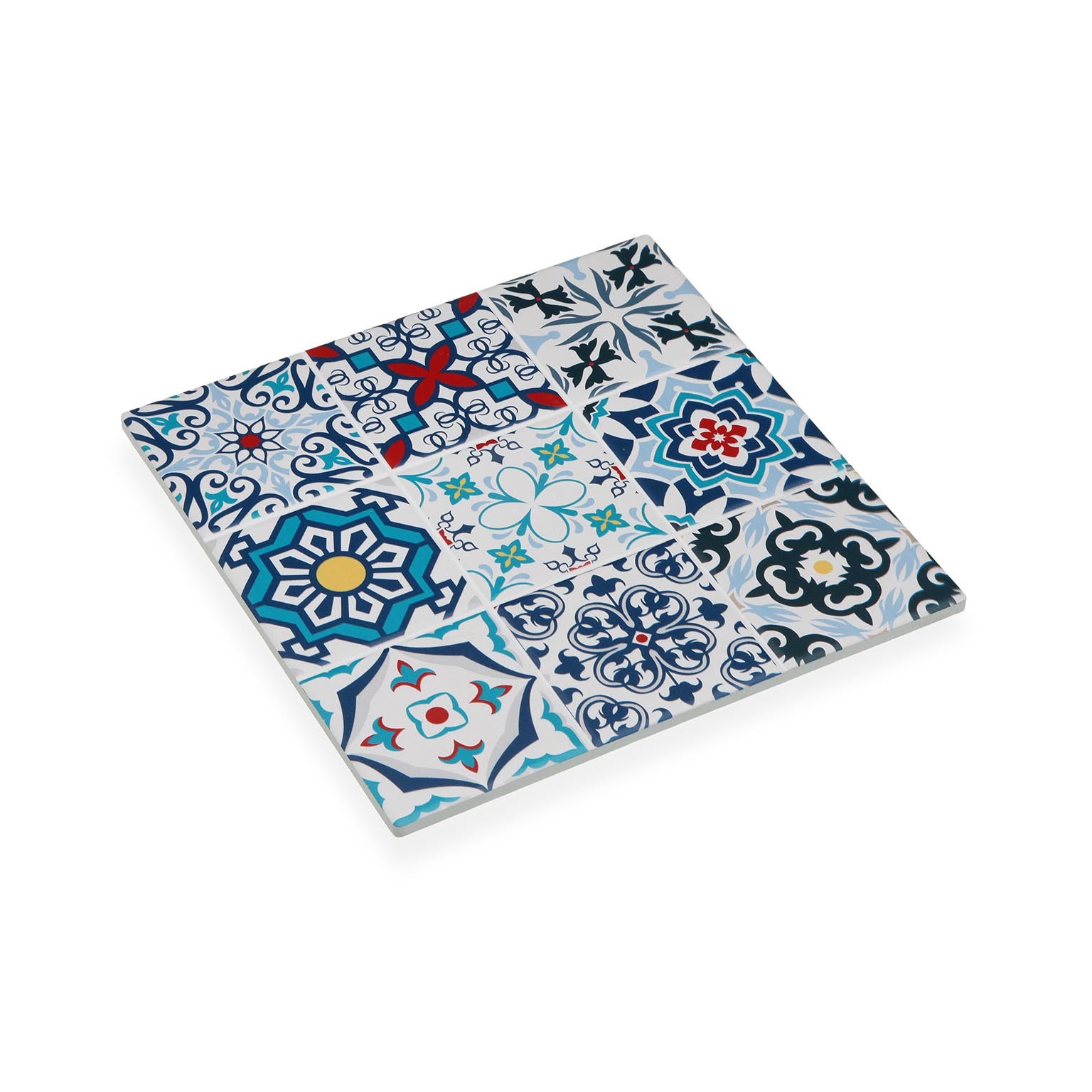 Con unas dimensiones de 20x20 cm, su atractivo diseño en tonos azules, blancos y detalles en rojo y verde evoca un estilo mediterráneo, ideal para complementar cualquier mesa.