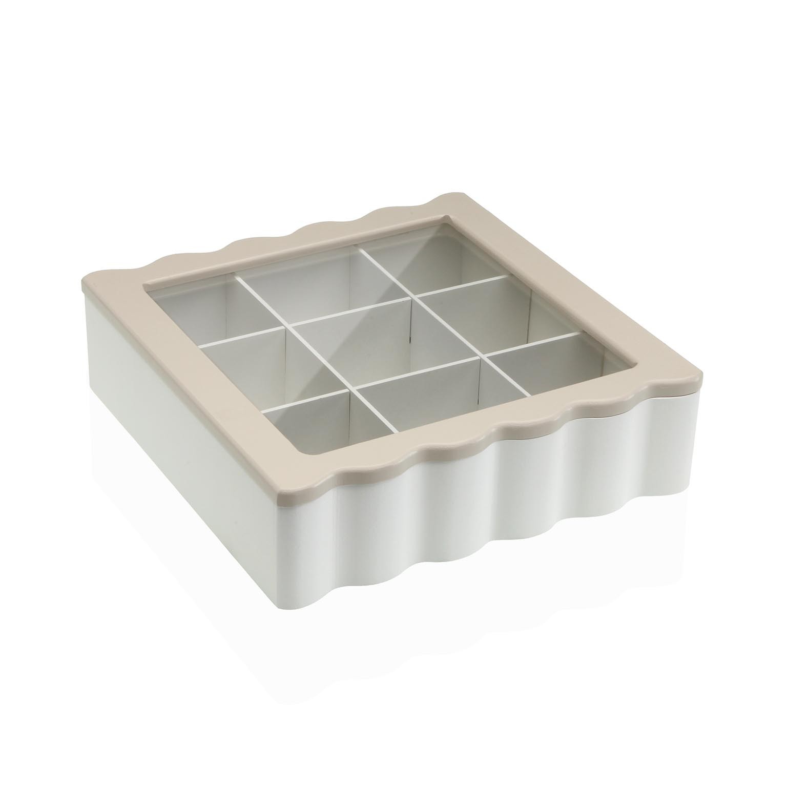 La caja de té blanca con 9 compartimentos es un elemento funcional y decorativo que optimiza el almacenamiento de infusiones y pequeños artículos de cocina.