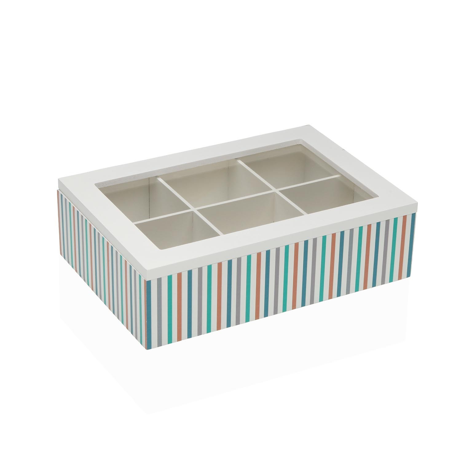 La caja de té rayas con 6 compartimentos es una solución práctica y estilizada para la organización de diferentes variedades de té.