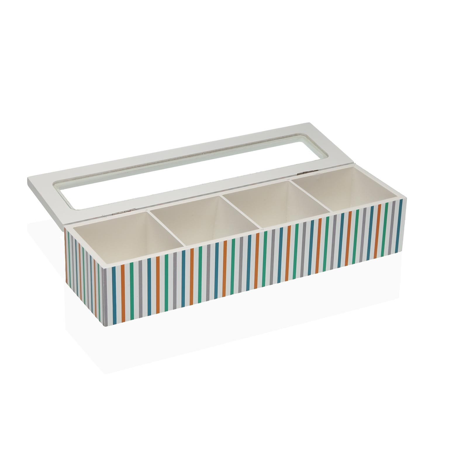 La caja de té rayas con 4 compartimentos es un elemento decorativo y funcional que organiza diferentes variedades de té.