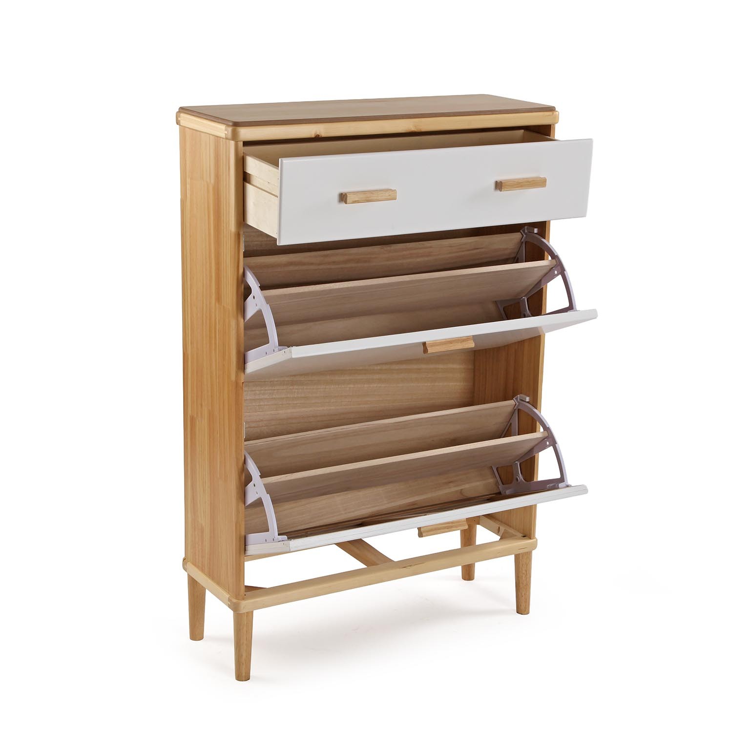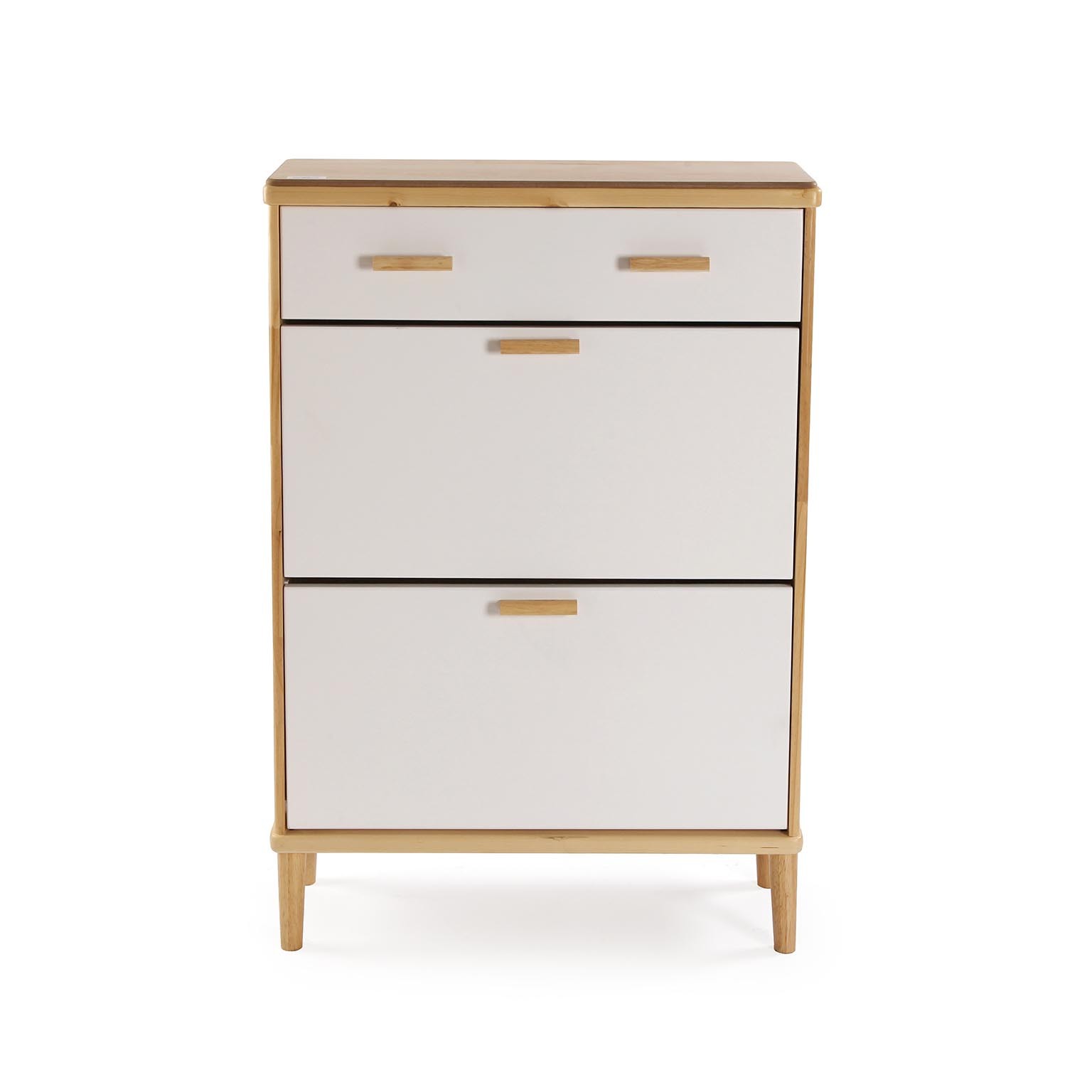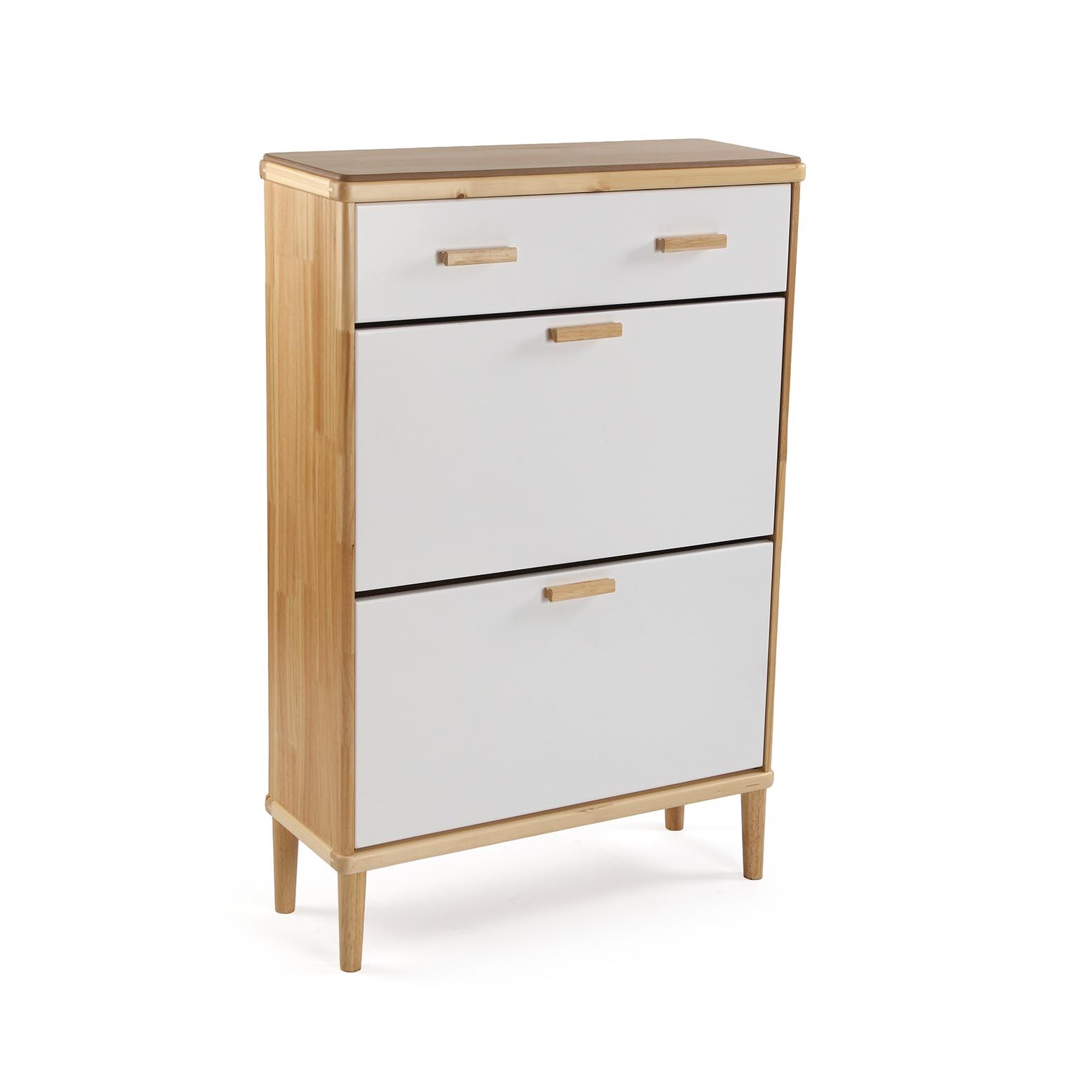 Sus cajones de ratán y contrachapado permiten un almacenamiento eficiente del calzado, mientras que sus líneas limpias y acabados en blanco y madera natural aportan un toque contemporáneo a la decoración.