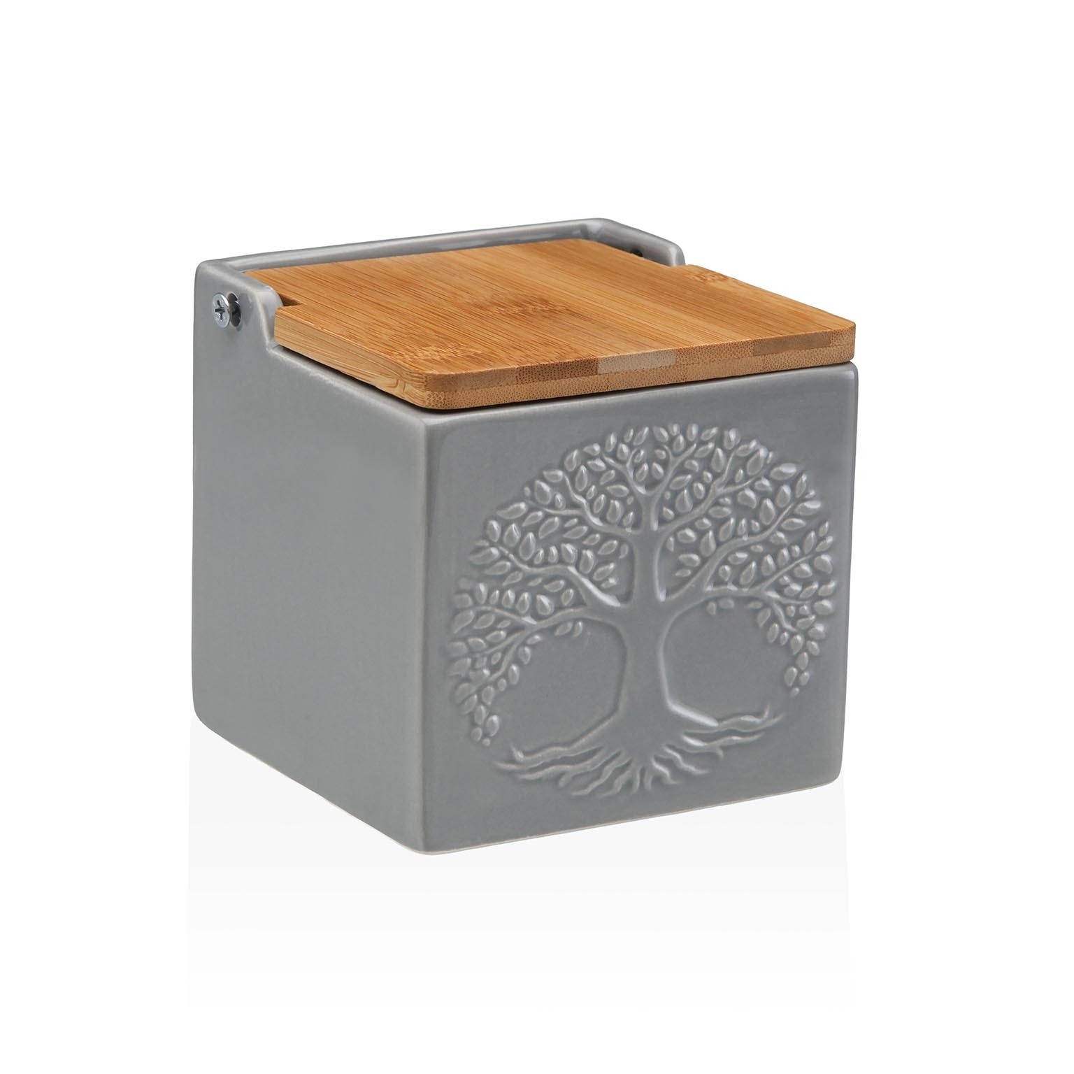 Fabricado en cerámica gris con una tapa de bambú, este salero de 11x11x11 cm es ideal para almacenar sal y otros condimentos.