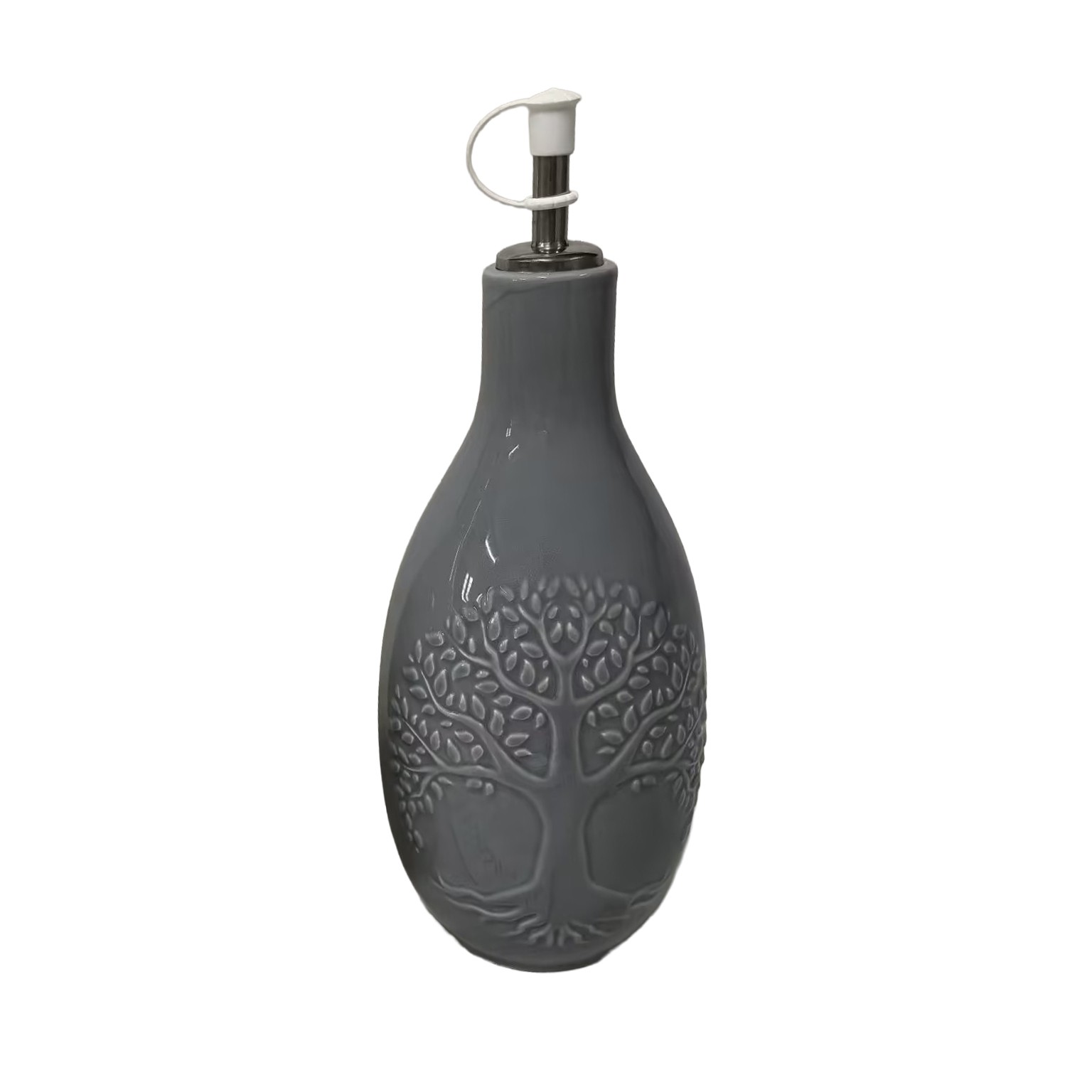 La aceitera gris árbol es un recipiente de cerámica con un diseño moderno y orgánico, ideal para almacenar y servir aceites de cocina.