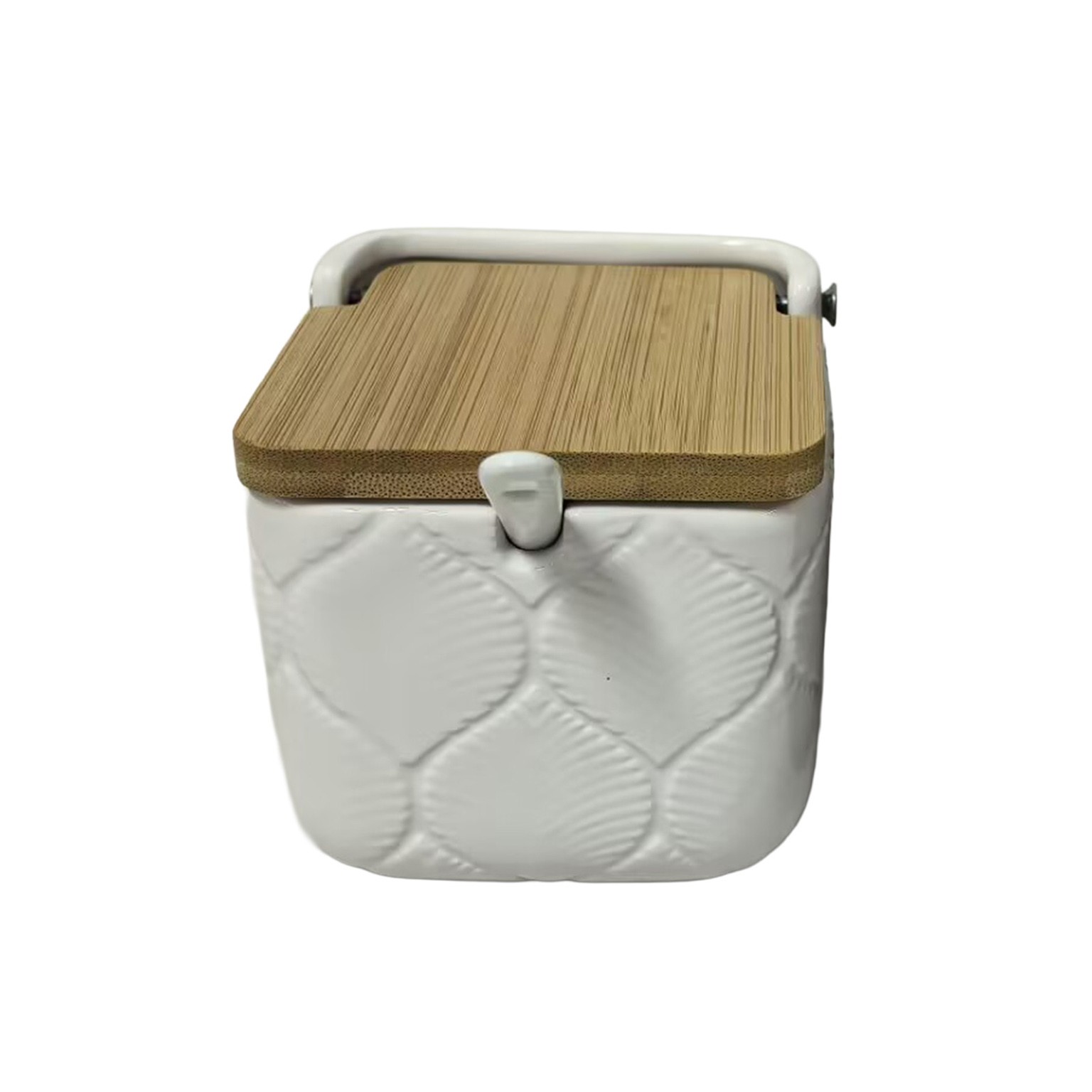 Fabricado en cerámica blanca y con una tapa de bambú, su diseño minimalista aporta un toque moderno a cualquier ambiente.