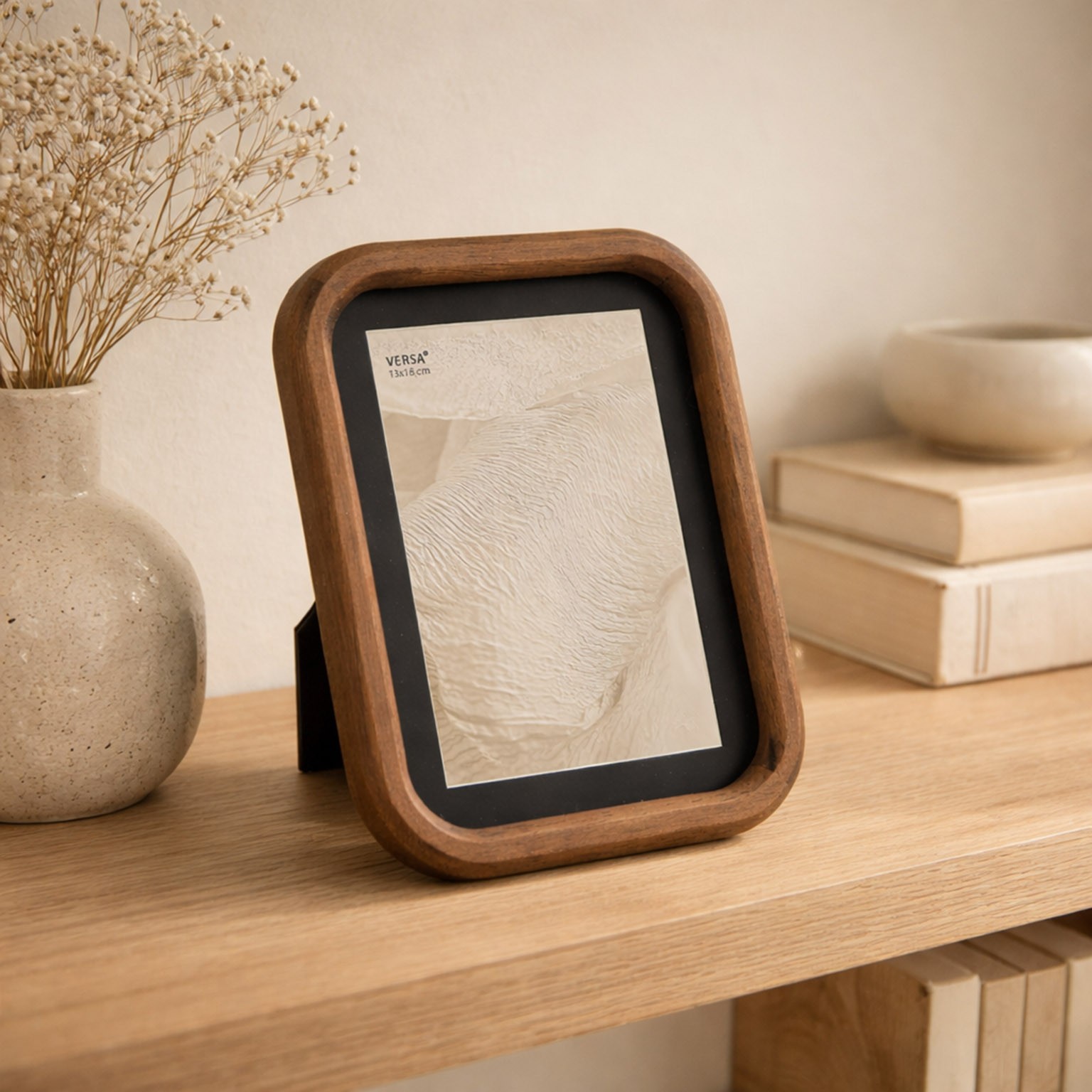 Fabricado en madera de mango, presenta un diseño rústico con un toque moderno, ideal para exhibir fotografías en diversos entornos.