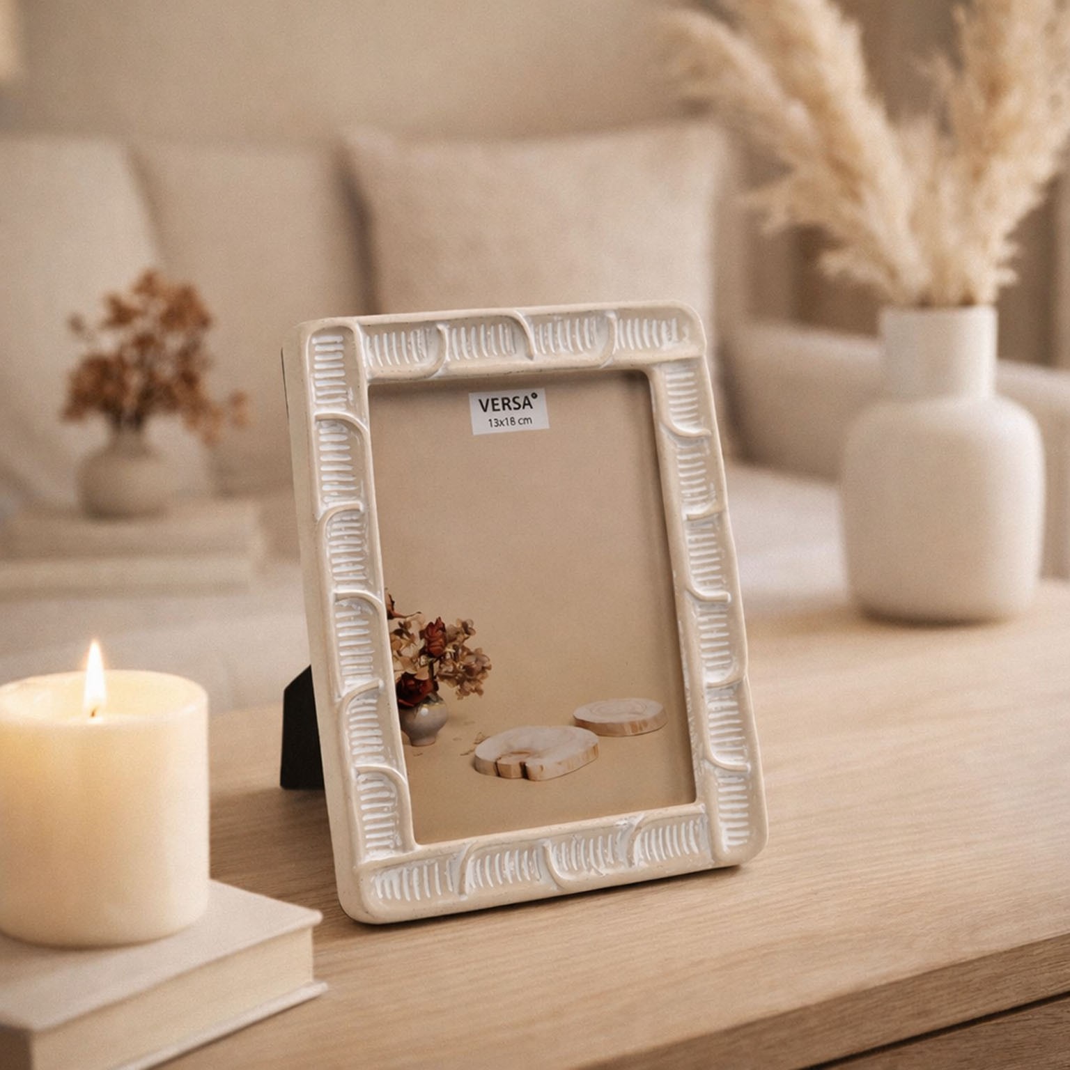 El portafoto de resina Vassa 13x18 es una pieza decorativa que combina modernidad y un toque rústico gracias a su textura.