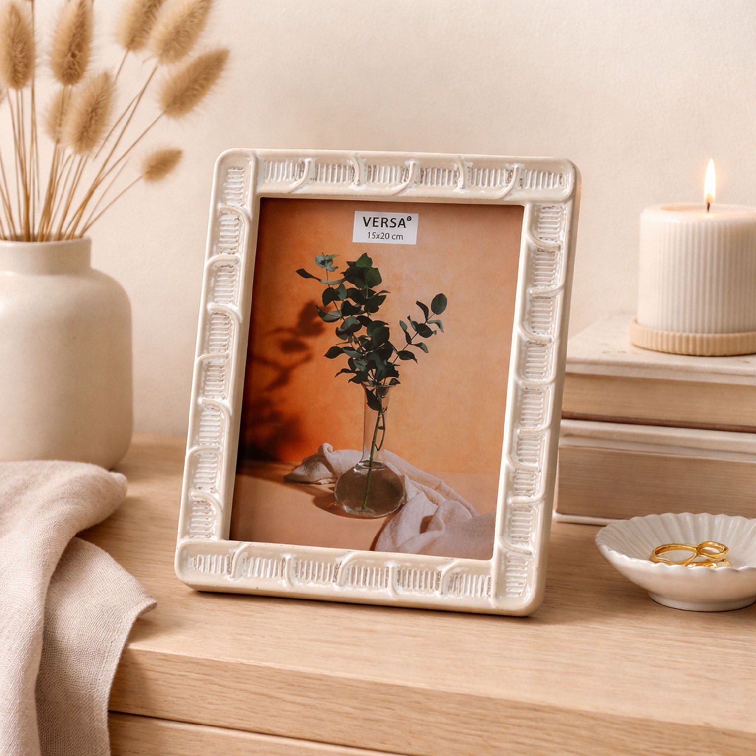 El portafoto de resina Vassa 15x20 combina un diseño moderno con toques vintage, ideal para realzar la decoración de cualquier espacio del hogar.