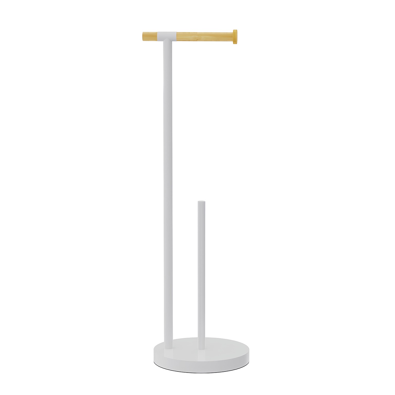 El portarollos de bambú blanco es un accesorio funcional y estético para el baño, diseñado con una estructura de hierro pintado en blanco y un elegante mango de bambú.