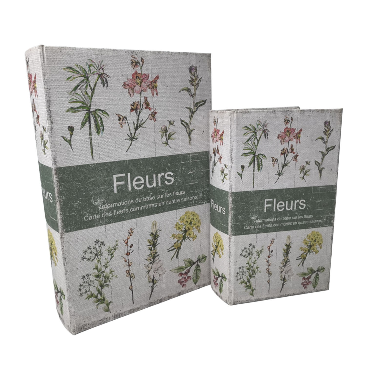 Fabricados en lienzo y madera MDF, presentan un diseño floral en tonos neutros con detalles en verde, ideales para estanterías o mesas de café.